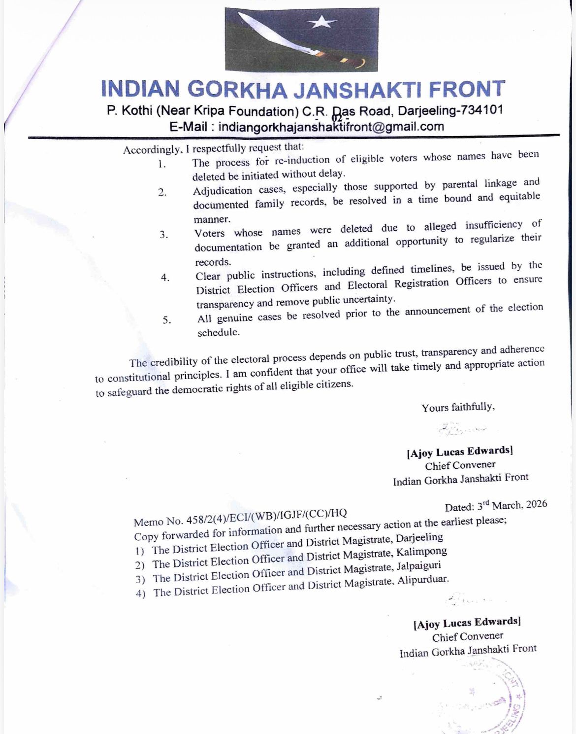 दार्जिलिङ: पश्चिम बंगालमा विधानसभा चुनाव अघि नै खाँटी रैथाने नागरिकहरूको नाम मतदाताको सूचीमा समावेश गरियोस भन्ने मांग गर्दै इण्डियन गोर्खा जनशक्ति फ्रण्टको प्रतिनिधि टोलीले आज कोलकातास्थित राज्य निर्वाचन आयोग कार्यालयमा ज्ञापन पत्र चढाएका छन्। हिजो आइताबार इण्डियन गोर्खा जनशक्ति फ्रण्टको चार प्रतिनिधि टोली कोलकता प्रस्थान भएका थिए।उक्त टोलीमा आईजीजेएफको श्रमिक संघ हाम्रो हिल तराई डुवर्स चिया श्रमिक संघको केन्द्रीय अध्यक्ष डीके गुरूङ, पार्टी कार्यालय सचिव भीम सुनाम, तराई डुवर्सको पार्टी कोअर्डिनेटर आयुष अधिकारी र डुवर्सबाट रंजीत लकडा सामेल रहेका थिए। इण्डियन गोर्खा जन शक्ति फ्रण्टको चार प्रतिनिधि टोलीले आज दिउँसो कोलकताको राज्य निर्वाचन आयोग कार्यलयमा पश्चिम बंगाल विधानसभा चुनाव अघि नै यहाँ खाँटी रैथाने नागरिकहरूको पुनः मतदाता सूचीमा समावेश गरिनुपर्छ भन्ने माग गर्दै ज्ञापन पत्र सुम्पिएको छ। गत केही महिना अघिदेखि पश्चिम बंगालमा एसआईआर लागु भएको छ। निर्वाचन आयोगले गत २८ फरवरी २०२६ को दिन मतदाता सूची जारी गरेका छन्। २०२४ को मतदाता सूचीको आधारमा दार्जीलिङ जिल्लाबाट १ लाख ४४ हजार ६ सय ४८ मतदाताहरूको नाम हटाउने,आशंकाको सूचीमा समावेश गर्ने जस्ता कार्य गरिएको छ।इण्डियन गोर्खा जनशक्ति फ्रण्टले स्थानीय रैथाने खाँटी नागरिकहरूको नाम पश्चिम बंगाल विधानसभा चुनाव अघिनै मतदाता सूचीमा समावेश गरिनु पर्छ भन्दै आइहेको छ अनि त्यही माग राज्य निर्वाचन आयोगको कार्यलय समक्ष राखेको छ।जसको नाम मतदाताको सूचीबाट हटाएको छ तर उनीहरू यहाँकै खाँटी रैथाने नागरिकहरू हुन उनीहरूको नाम मतदाता सूचीमा अविलम्ब समावेश गरिनु पर्छ। एसआईआरको क्रममा जति पनि मतदाताहरूको नामलाई आशंकाको सूचीमा राखिएको छ उनीहरूको नाम मतदाता सूची समावेश गरिनु पर्छ। अभिभावकहरूको दस्तावेजसंग जोडिएका तथा परिवारसंग जोडिएका मतदाताहरूको नाम अविलम्ब नगरी मतदाता सूचीमा समावेश गर्न पर्छ। कागज पत्र पूरा नभएका मतदाताहरूलाई आफ्नो कागज पत्र जम्मा गर्न निर्वाचन आयोगले थप समय दिनु पर्छ। जनतामा भएको अन्योलतालाई हटाउन जिल्ला निर्वाचन अधिकारी पादर्शिता राखेर कार्य गरियोस् भन्ने मागहरू इण्डियन गोर्खा जनशक्ति फ्रण्टले राज्यको निर्वाचन आयोग कार्यलयमा चढाएको ज्ञापन पत्रमा उलेख गरेका छन्।