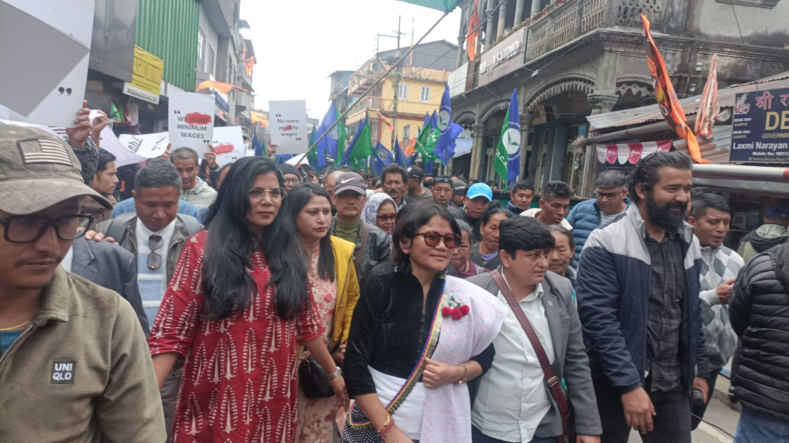 खरसाङ: खरसाङ विधानसभा समष्टिको लागि ईण्डियन गोर्खा जनशक्ति फ्रण्टकी उम्मेद्वार बन्दना राईको पक्षमा आज खरसाङमा परिवर्तन रैलीको नाममा चुनावी रैलीको आयोजना गरिएको छ। ईण्डियन गोर्खा जनशक्ति फ्रण्टको भातृ संगठन हाम्रो हिल तराई डुवर्स चियाबारी श्रमिक संगठनको आयोजनामा बन्दना राईको पक्षमा चुनावी रैलो आयोजना गरिएको छ। उक्त रैली खरसाङको रेलवे स्टेशन परिसरबाट शुरु भएर हिल कार्ट रोड हुँदै खरसाङ बजार परिक्रमा गर्दै आईएनए बस टर्मिनलसम्म पुगेर चुनावी पथ सभामा परिणत भएको छ। उक्त परिवर्तन रैलीमा खरसाङ विधानसभा समष्टिको लागि ईण्डियन गोर्खा जनशक्ति फ्रण्टकी उम्मेद्वार बन्दना राईको पक्षमा भोटको अपिल गरिएको छ। परिवर्तनको नाराको साथमा आयोजना गरिएको उक्त रैलीमा चियाबारी श्रमिकहरुको पक्षमा विभिन्न प्ला कार्डहरु बोकेर विभिन्न नाराहरुका साथमा परिवर्तनको लागि रैली आयोजना गरिएको छ। उक्त परिवर्तनको रैलीमा उम्मेद्वार बन्दना राई र ईण्डियन गोर्खा जनशक्ति फ्रण्टको केन्द्रीय र महकुमा स्तरीय पदाधिकारीहरु र कार्यकर्ताहरुले विभिन्न नाराको साथमा स्थानीयहरु समक्ष बन्दना राईलाई चुनाउमा भोट दिएर जिताउने आह्वान् गरेका छन्। उक्त रैली खरसाङको बस टर्मिनलमा पुगेर चुनावी पथ सभामा परिणत भएको थियो जसमा ईण्डियन गोर्खा जनशक्ति फ्रण्टको केन्द्रीय संयोजक अजय एडवर्ड्स, एनबी खवास, भरत तामाङ, हाम्रो हिल तराई डुवर्स चियाबारी श्रमिक संगठनको केन्द्रीय अध्यक्ष डीके गुरूङ लगायत अन्य पदाधिकारीहरु उपस्थित रहेका थिए। बस टर्मिनलमा आयोजित चुनावी पथ सभालाई जतन राईले सञ्चालन गरेका थिए भने खरसाङ विधानसभा समष्टिकी उम्मेद्वार बन्दना राई, हाम्रो हिल तराई डुवर्स चियाबारी श्रमिक संगठनको केन्द्रीय अध्यक्ष डीके गुरूङ र केन्द्रीय संयोजक अजय एडवर्ड्सले सम्बोधन गरेका थिए।