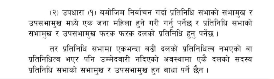 धारा ९१ को उपधारा (२) अनुसार सभामुख र उपसभामुखमध्ये एक जना महिला हुनुपर्नेछ र दुवै जना फरक–फरक दलबाट हुनुपर्ने व्यवस्था गरिएको छ।