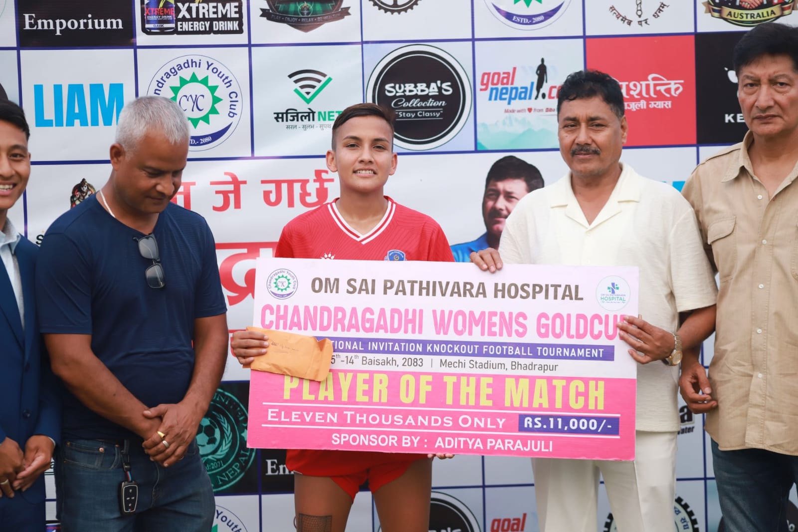 ह्याट्रिककर्ता रेखा पौडेल खेलको ‘प्लेयर अफ द म्याच’ घोषित भइन्। उनले नगद ११ हजार रुपैयाँ पुरस्कार प्राप्त गरिन्। प्रतियोगिता अन्तर्गत सोमबारको खेल सशस्त्र प्रहरीको एपीएफ फुटबल क्लब र ओखलढुंगाको पदमा स्पोर्टिङ क्लबबीच हुने आयोजकले जनाएको छ।