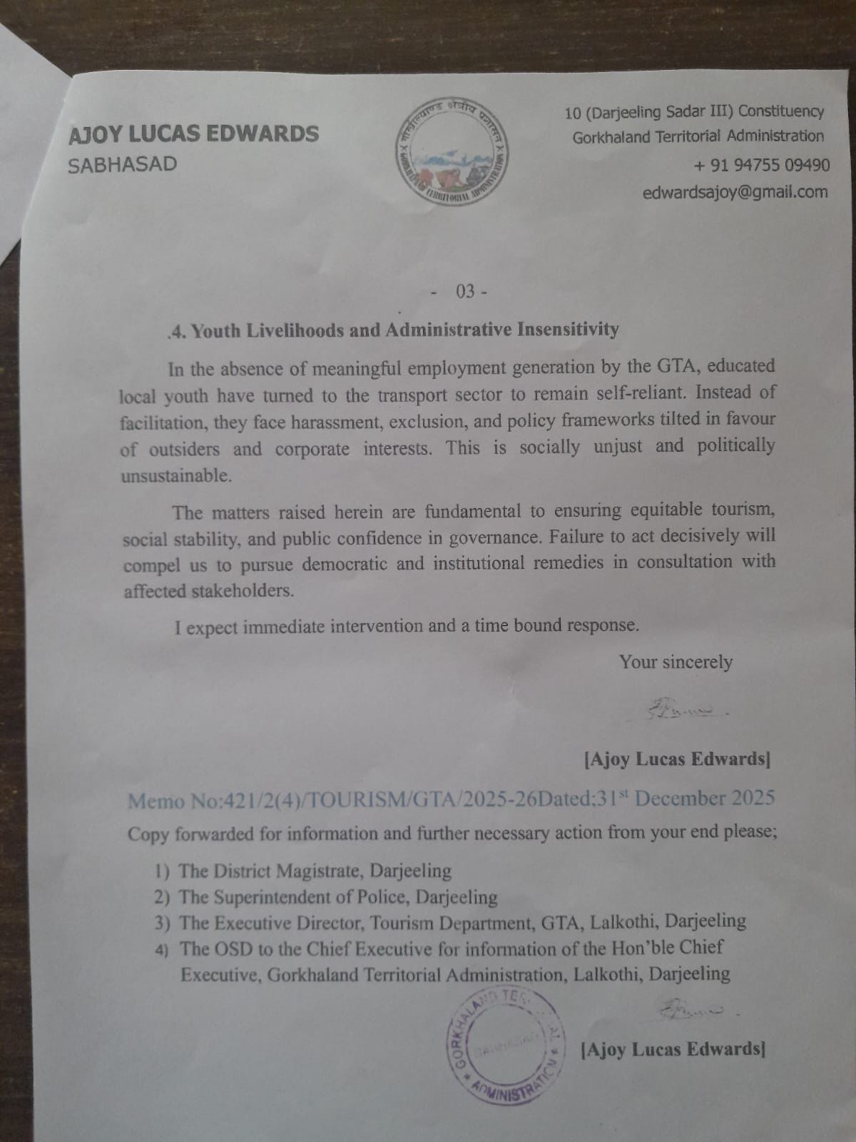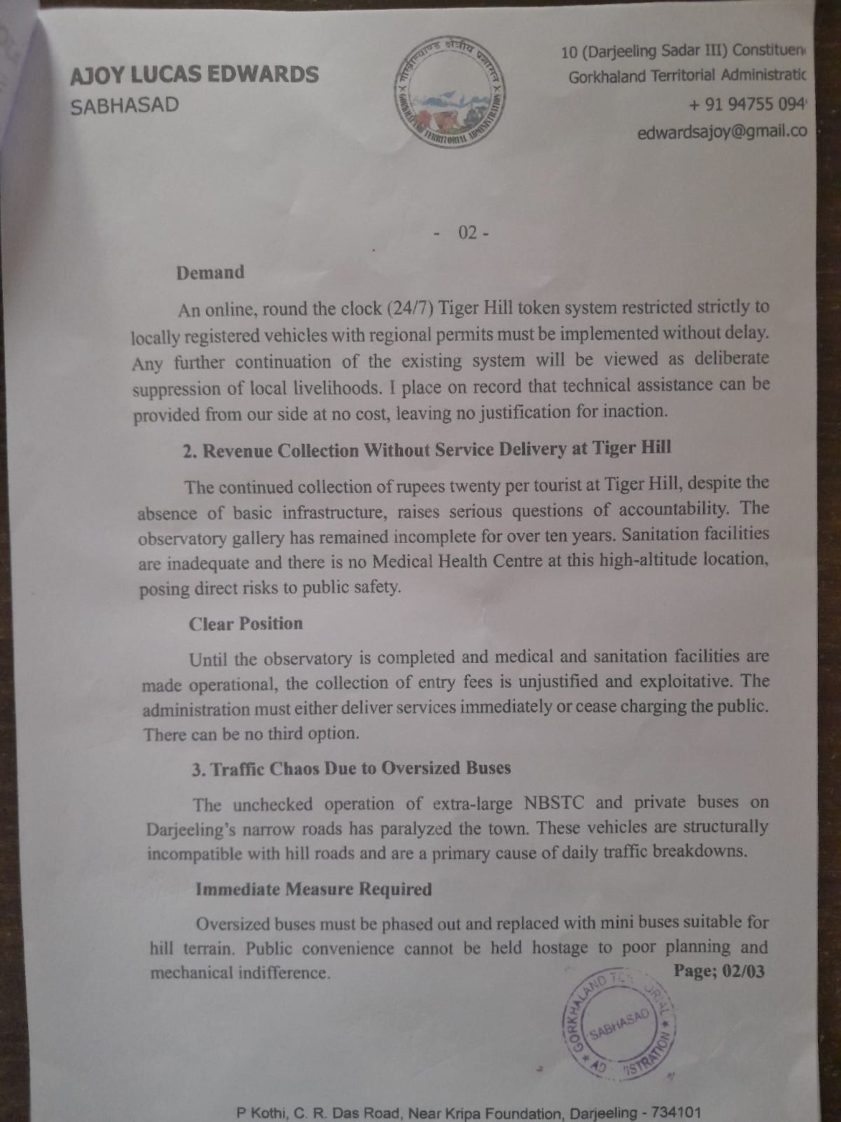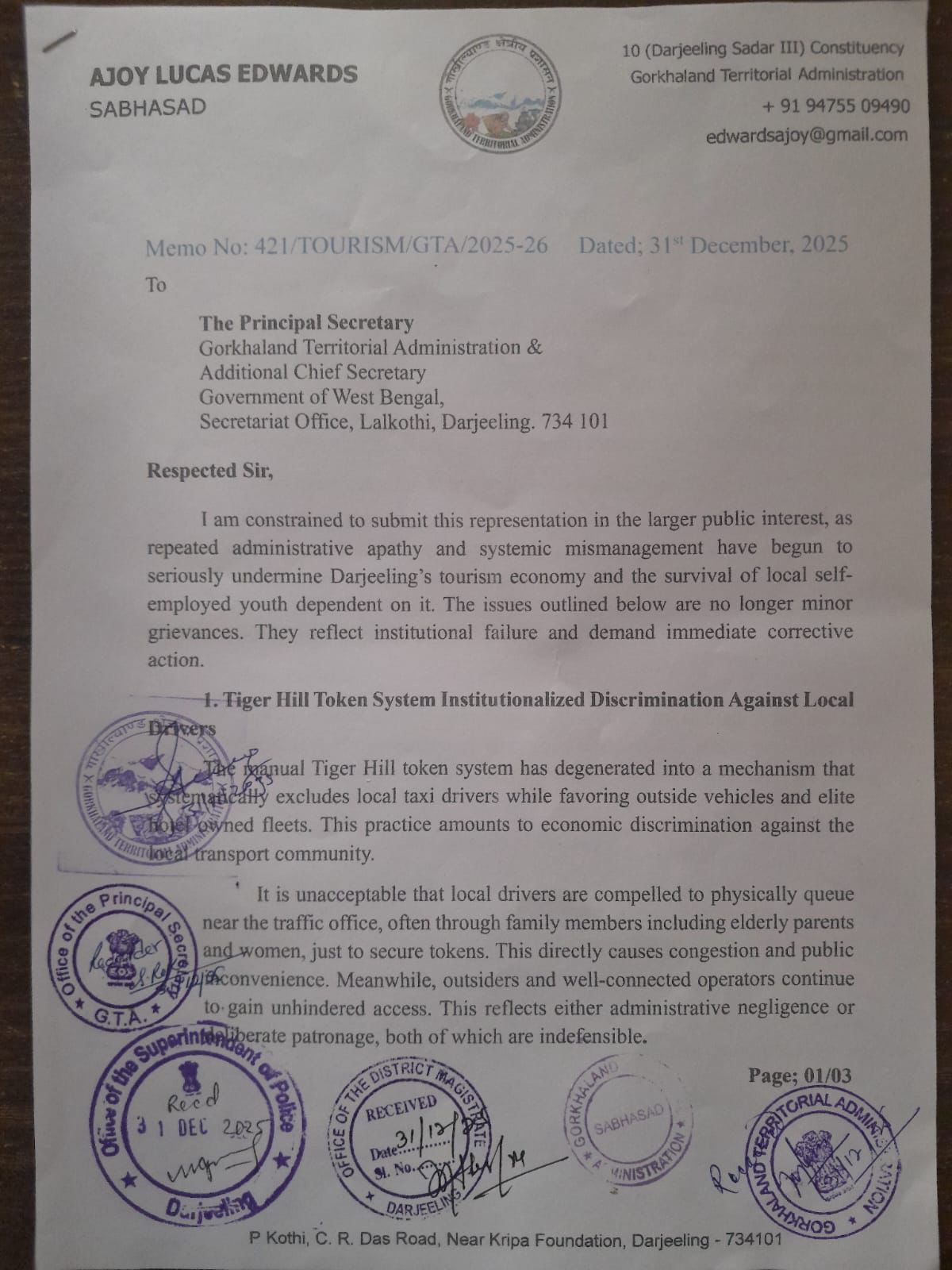 दार्जीलिङ: क्षेत्रीय सरकार साथै प्रशासनको उदासीनताको कारणले दार्जीलिङको पयर्टन अर्थतन्त्रमा दिन प्रतिदिन गम्भीर प्रभाव पर्दै गईरहेको इण्डियन गोर्खा जन शक्ति फ्रण्टको केन्द्रीय संयोजक तथा निर्वाचित सभासद अजय एडवाडर्सले गोर्खाल्याण्ड क्षेत्रीय प्रशासनको मुख्य सचिवलाई लेखेको पत्रमा उल्लेख गरेका छन्। दार्जीलिङ पहाडको वर्तमान स्थिति र गाडी चालकहरूले भोग्नु परिरहेको विभिन्न समस्याहरूमाथि ध्यानाकर्षण गर्दै आईजीजेएफ संयोजक तथा निर्वाचित सभासद अजय एडवाडर्सले जीटीएको मुख्य सचिवलाई आज पत्रचार गरेको छ। पत्रको प्रतिलिपि जिल्लापाल, पुलिस अधीक्षक, जीटीएको पयर्टन विभागीय अधिकारी, जीटीए चिफ समक्ष पठाएका छन्।सभासद एडवाडर्सले आफ्नो पत्रमा जीटीए तथा प्रशासनको उदासिनताको कारणले गर्दा दार्जीलिङको पयर्टन अर्थतन्त्रमा दिन प्रतिदिन प्रभाव पर्दै आईरहेको छ, जसले गर्दा पर्यटन उद्योगमाथि निर्भर रहेका स्थानीय स्वरोजगार युवाहरूमा गम्भीर प्रभाव पर्दै गईरहेको बताएका छन्। दार्जीलिङको प्रसिद्व पयर्टन स्थल टाइगर हिलको प्रवेशमा जीटीए तथा प्रशासनले टोकन साथै शुल्क जारीको छ।सञ्चालनमा आईरहेको म्यानुअल टाइगर हिल टोकन प्रणालीदेखि स्थानीय गाडी चालकहरूलाई बाहिर राख्ने साथै बाहिरबाट आउने गाडीहरूलाई टाइगर हिलको प्रवेशमा रोक लगाउने सभासद एडवाडर्सले आफ्नो पत्रमा मांग गरेका छन्। दार्जीलिङको कतिपय पयर्टन स्थलहरूको बाटो असुविधा रहेको हुनाले बाहिरबाट आएका गाडी चालकहरूलाई यी विषयहरूमा उचित ज्ञान नभएको हुनाले दुर्घटना, ट्राफिक जाम आदि जस्ता समस्याहरू उत्पन्न हुने गरेको पत्रमा उलेख गरेका छन्।टाइगर हिल दार्जीलिङको प्रसिद्व पयर्टन स्थलहरूमध्ये एउटा हो।विभागले प्रत्येक पयर्टकहरूबाट २० रूपियाँ प्रवेश शुल्क लिने गर्छ तर विगत १० वर्षदेखि निर्माणाधीनमा रहेको ग्यालरी आजसम्म पूरा हुन सकेको छैन।जसले गर्दा पयर्टकहरूले जोखिम उठाउँदै टाइगर हिलबाट सुर्योदयको दृश्य हेर्न बाध्य छन्।टाइगर हिलमा सर सफाईको व्यवस्था छैन,जता तताई फोहोरहरूको थुप्रो देखिन्छ। यसबारे जीटीए तथा प्रशासनले उचित कदम उठाउन जरूरी छ साथै प्रवेश शुल्क उठाउने कार्य बन्द गरिनु पर्छ भन्ने मांग सभासद एडवाडर्सले आफ्नो पत्रमा उलेख गरेका छन्।दार्जीलिङको सडक अति नै सानो र साँघुरो रहेको हुनाले त्यसै पनि ट्राफिक जाम आदि जस्ता समस्याहरू हुने गर्छन् त्यहीमाथि राज्य सरकारले एनवीएसटीसीको बस सेवा संचालन गरेर दार्जीलिङको ट्राफिक समस्यालाई अझ जटिल बनाएको छ। त्यसकारण सरकारले यस ठूलो बस सेवा कार्यलाई बन्द गरेर मिनी बस सेवा शुरू गरी दिने पत्रमा अनुरोध गरेका छन्। जीटीएले रोजगार योजनाहरू सृजना गर्न न