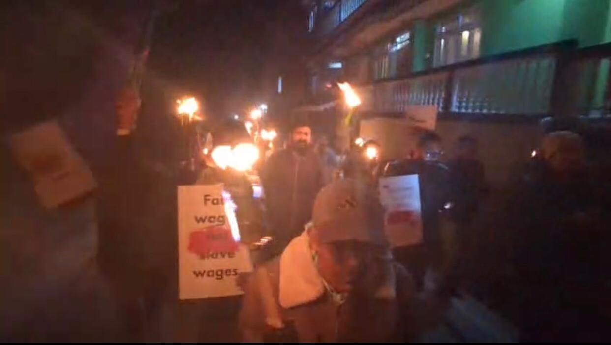 खरसाड: तीनधारेमा आईजीजेएफको श्रमिक संगठनले राँके जुलुस निकालेको छ। यसको साथै सरकारको चौकीमा बस्नेहरूले श्रमिकहरूलाई चुनावमा मात्र सम्झिने गर्छ भनी आरोप लगाएका छन्। पहाड तराई डुवर्स क्षेत्रका चिया बगानहरूमा अविलम्ब मिनिमम वेजेस लागु गर्ने माग गर्दै इण्डियन गोर्खा जनशक्ति फ्रण्टको श्रमिक संगठन हाम्रो हिल तराई डुवर्स चियाबारी श्रमिक संघले खरसाङको तीनधारे क्षेत्रमा राँके जुलुस निकालेको छ। यस राँके जुलुसमा चिया श्रमिकहरूको पनि उपस्थिति रहेको थियो। राँके जुलुसलाई सम्बोधन गर्ने क्रममा हाम्रो हिल तराई डुवर्स चियाबारी श्रमिक संघको नेतृत्वहरूले सरकारमा बस्नेहरूले चुनावको समयमा मात्र चिया श्रमिकहरूको कुरा गर्ने गर्छ तर चुनाव सकेपछि मालिकवर्गलाई काखी चेप्छ। हाम्रो हिल तराई डुवर्स चियाबारी श्रमिक संघले चिया बगानहरूमा मिनिमम वेजेस चाहिन्छ भन्ने विषय हरूको जानकारी गराउँदै राज्यको श्रम मन्त्रालयदेखि लिएर सम्बंधित विभागीय अधिकारीहरूलाई पत्रचार गर्ने काम गर्दै आइरहेको बताएका छन्। आजको महंगाइको समयमा कम रोजीले चिया श्रमिकहरूले आफ्नो घर परिवारहरूको पालन पोषण गर्न धेरै गाह्रो भइरहेको छ। स्पष्ट शब्दमा भन्नु हो भने यति कम रोजीले श्रमिकहरूको पेटमा आगोको ज्वाला सल्किरहेको छ। श्रमिक आमा बाउहरूले आफ्नो नानीहरूलाई राम्रो स्कुल,कलेज पठाउन सकि रहेको छैन। राम्रो खाना दिनु सकेको छैन, एक जोडी राम्रो लुगा दिनु सकेको छैन। घर बिल्डिङहरूको निर्माण गर्ने मिस्त्रीहरूको दैनिक रोजी हजार रूपिया छ तर हरियो सुनको उत्पादन गर्ने चिया श्रमिकहरूको रोजी २ सय २० रूपियाँ छ यो कस्तो विडम्बना!यति कम रोजीमा श्रमिकहरूले आफ्नो जीविका कसरी चलाउदैछ यस विषयमा कुनै सरकारको चौकीमा बस्नेहरूले सोधेको छैन। सरकारले केवल मालिकवर्गलाई काखीमा चेप्ने काम गर्छ।मिनिमम वेजेस यतिका वर्षहरू बितिसक्दा पनि किन लागु हुन सकेको छैन सरकारको चौकीमा बस्नेहरूलाई हाम्रो प्रश्न छ।