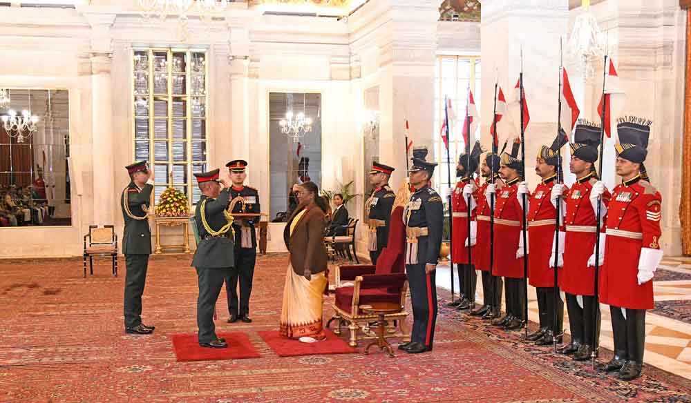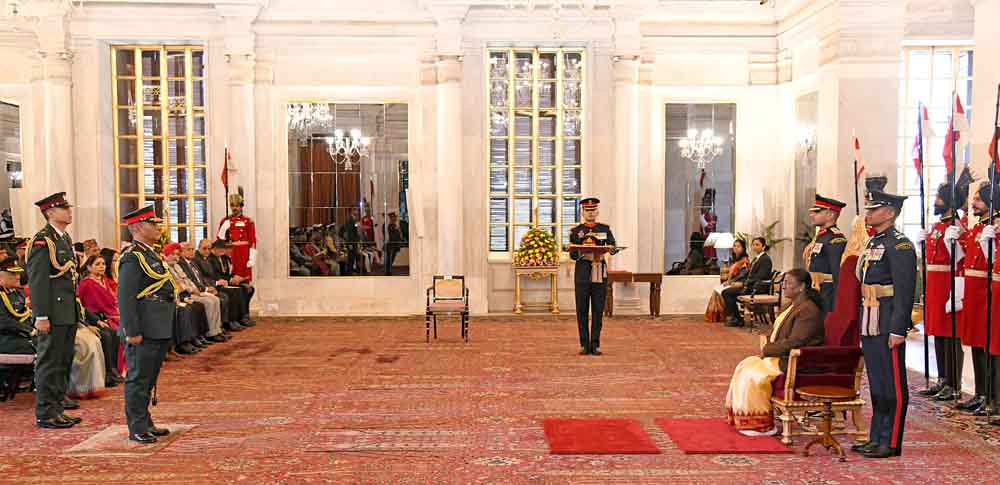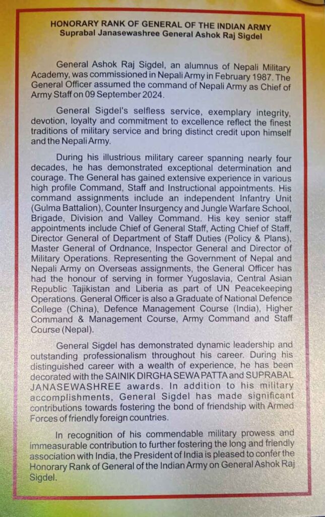 नयाँ दिल्ली: राष्ट्रपति द्रौपदी मुर्मुले आज (१२ दिसम्बर २०२४) राष्ट्रपति भवनमा आयोजित विशेष अलंकरण समारोहमा नेपाली सेनाका प्रधानसेनापति सुप्रबल जनसेवाश्री जनरल अशोक राज सिग्देललाई भारतीय सेनाको जनरलको मानार्थ उपाधि प्रदान गरिन्। उनलाई यो सम्मान नेपालको सैन्य कौशलप्रति सम्मान प्रकट गर्दै तथा भारत र नेपालबीचको दीर्घकालीन र मैत्रीपूर्ण सम्बन्धलाई अझ सुदृढ बनाउन गरेको अतुलनीय योगदानको कदरस्वरूप प्रदान गरिएको हो। -पीआईबी