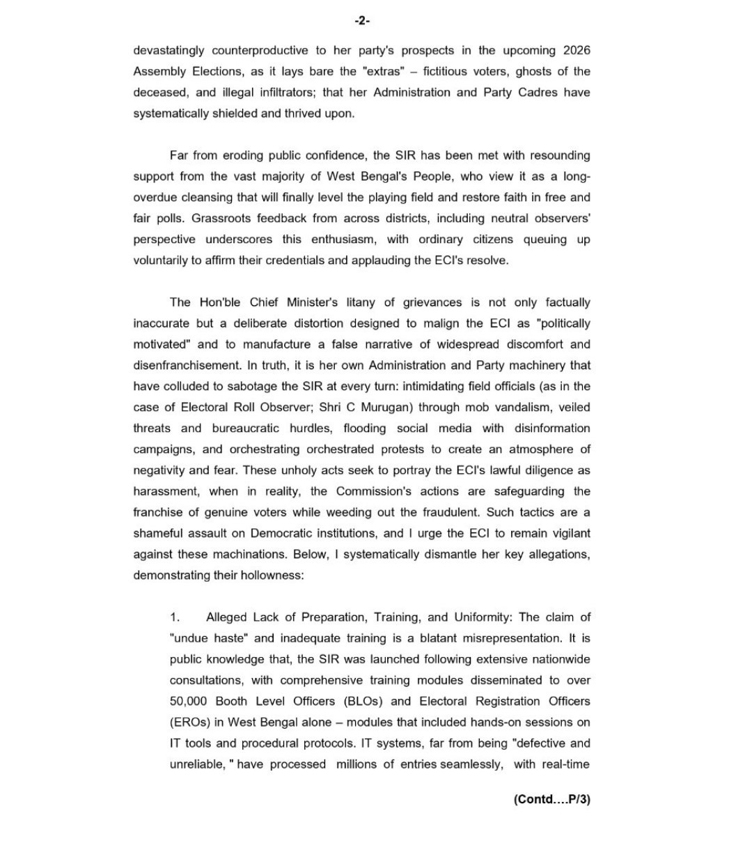 यो पत्र मुख्यमन्त्री ममता ब्यानर्जीले ३ जनवरीमा एसआईआर प्रक्रियालाई रोक्न माग गरेपछि लेखिएको हो। अधिकारीले चिट्ठीमा भने, “मुख्यमन्त्रीको अनुरोध हार स्वीकार गर्ने प्रयास हो र यसले चुनावी अनियमिततालाई निरन्तरता दिनेछ।” उनले राज्य प्रशासन र तृणमूल कांग्रेसका कार्यकर्ताहरूले फिल्ड अधिकारीहरूलाई धम्की दिने र गलत सूचना फैलाउने आरोप पनि लगाए।