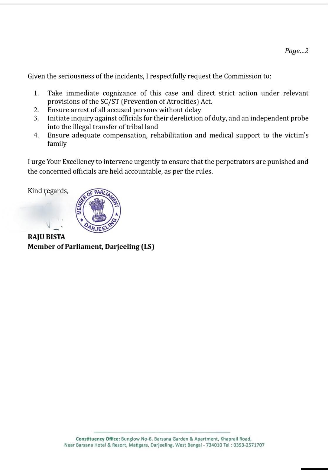 दार्जिलिङ: दार्जिलिङ लोकसभा सांसद राजु विष्टले पश्चिम बंगालका राज्यपाल डा. सी. भी. आनन्द बोस, राष्ट्रिय अनुसूचित जनजाति आयोग (एनसीएसटी) तथा राष्ट्रिय मानव अधिकार आयोग (एनएचआरसी) समक्ष दार्जिलिङ जिल्लाको फान्सिदेवा थाना अन्तर्गत झामकलाल गाउँमा एक अनुसूचित जनजाति महिलामाथि भएको भयावह हिंसा र शारीरिक आक्रमणको घटनामा तुरुन्त हस्तक्षेप गर्न औपचारिक अनुरोध गरे।
