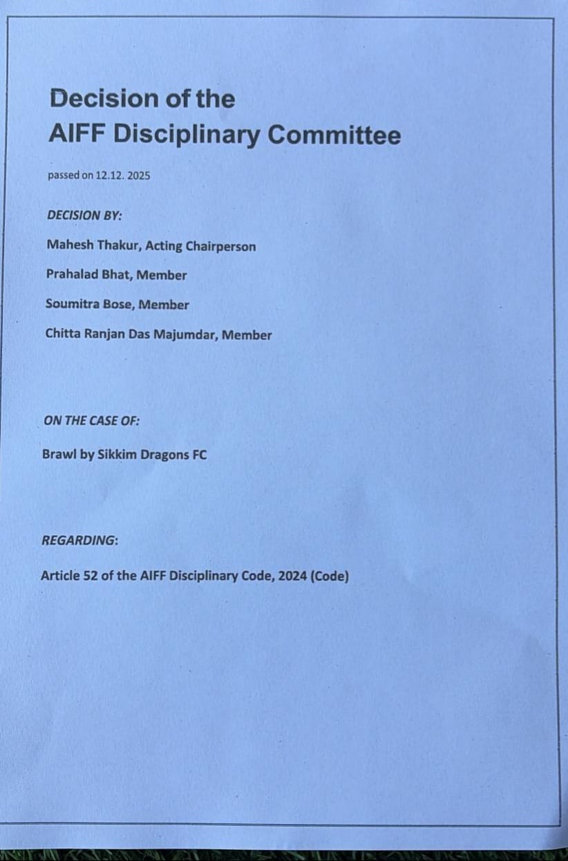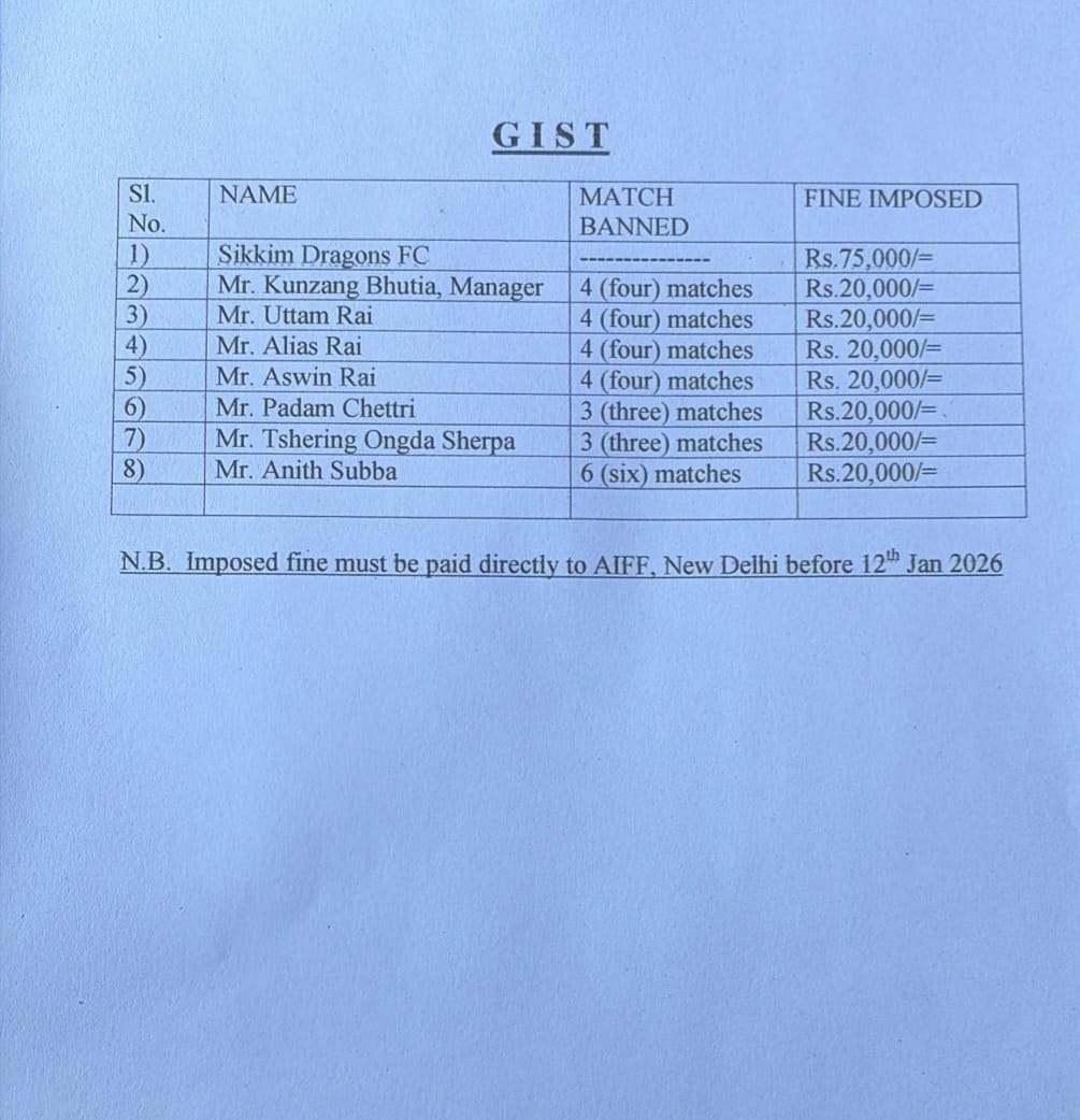 गान्तोक: यस साल गवर्नर्स गोल्ड कप फूटबल टुर्नामेण्टको अवधि मैदानमा अनुशासनहीनताले गर्दा अल इण्डिया फूटबल फेडरेशनको अनुशासनात्मक समितिले सिक्किम ड्रेगन्स फूटबल क्लबलाई कठोर शास्ती दिएको छ। सिक्किम फूटबल एसोसिएशनका तत्त्वावधानमा हुने यस प्रतिष्ठित टुर्नामेण्टको पहिलो सेमिफाइनल म्याचको अवधि मैदानमा अतिथि टीम राजस्थान युनाइटेडका खेलाड़ीहरूसँग कुटपीट गरिएको थियो। त्यस घटनाको भीडियो सोशल मीडिया प्ल्याटफर्महरूमा पनि निक्कै भायरल भएको थियो। त्यही घटनालाई केन्द्र गरेर एआईएफएफ-ले सिक्किम ड्रेगन्स एफसी-माथि ७५ हजार रुपियाँको जरिमाना लगाएको छ। टीमका म्यानेजर कुञ्जांग भूटियामाथि पनि ४ म्याचको प्रतिबन्ध र २० हजार रुपियाँको जरिमाना लगाइएको छ। यसबाहेक खेलाड़ीहरू उत्तम राई, एलिआस राई र अश्विन राईमाथि ४ म्याचको प्रतिबन्ध र २० हजार रुपियाँको जरिमाना लगाइएको छ। पदम छेत्री र छिरिंग ओंगदा शेर्पामाथि ३ म्याचको प्रतिबन्ध र २० हजार रुपियाँको जरिमाना लगाइएको छ। यसबाहेक अनिथ सुब्बामाथि ६ म्याचको प्रतिबन्ध र २० हजार रुपियाँको जरिमाना लगाइएको छ। सिक्किम ड्रेगन्स एफसी विरुद्ध सेमिफाइनलमा जीतपछि राजस्थान युनाइटेडले पछिबाट च्याम्पियन बन्ने गौरव पनि हासिल गरेको थियो।