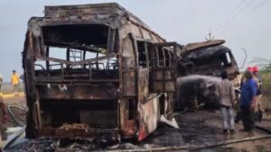 विजयवाडा: आन्ध्र प्रदेशको विजयवाडा-हैदराबाद राजमार्गमा एउटा दुःखद दुर्घटना भएको छ। यहाँ बस र ट्रक एकआपसमा ठोक्किएपछि बसमा आगो लागेको थियो। उक्त घटनामा ६ जनाको जलेर मृत्यु