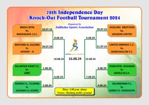 जलढाका: जलढाका स्पोर्ट्स एसोसिएशनको तत्त्वावधानमा आउँदो २८ जुलाईदेखि ७८औं इण्डिपेण्डेन्स डे नक्आउट फूटबल टुर्नामेण्टको आयोजन गरिनेछ। झोलुंग खेल मैदानमा हुने यस टुर्नामेण्टमा जम्मा १६ वटा टीमले