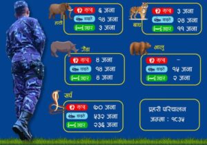 झापा: सर्प, बाघ, गैँडा, हात्ती र भालुको आक्रमणबाट पछिल्ला पाँच महिनाको अवधिमा ८३ जना नेपालीको मृत्यु भएको छ। नेपाल प्रहरीको तथ्यांकअनुसार चालु आर्थिक वर्ष २०८१/०८२ को