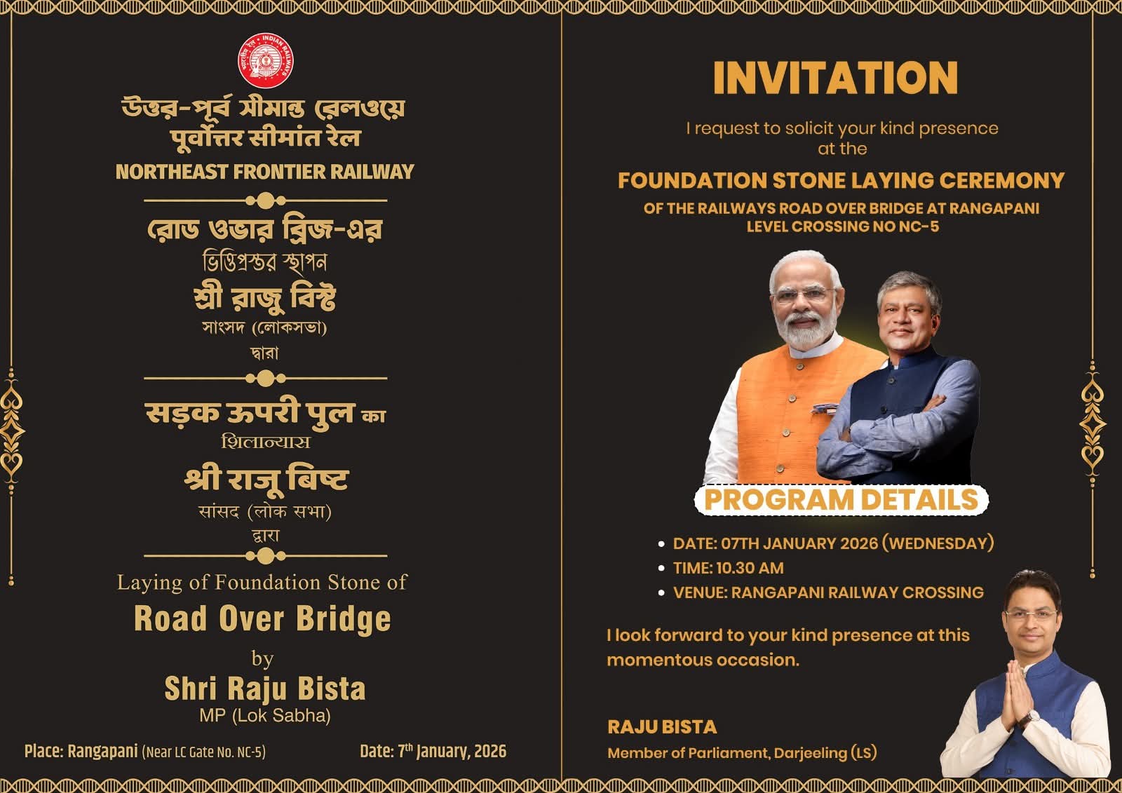 সাংসদ রাজু বিস্ট রঙ্গাপানি রেল ওভার ব্রিজের ভূমি পূজন ও শিলান্যাস অনুষ্ঠানের আয়োজন করবেন