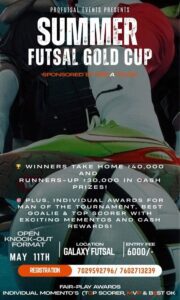 सिलगढ़ी: प्रोफूटसल इभेण्ट्सको तत्त्वावधानमा समर फूटसल गोल्ड कपको आयोजन गरिनेछ। ११ मईमा हुने यस फाइव ए साइड टुर्नामेण्टको आयोजन सिलगढ़ीको ग्यालेक्सी फूटसल एरेनामा हुनेछ। टुर्नामेण्टमा च्याम्पियन