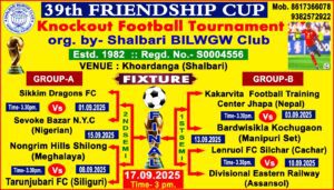 खोआरडांगा: शारबारी बीआईएलडब्ल्यूजीडब्ल्यू क्लबको तत्त्वावधानमा ३९औं फ्रेण्डशीप कप फूटबल टुर्नामेण्ट १ सेप्टेम्बरदेखि शुरु हुनेछ। खोआरडांगा (शालबारी) मा हुने यस टुर्नामेण्टमा जम्मा ८ वटा टीमले हिस्सा लिनेछ।