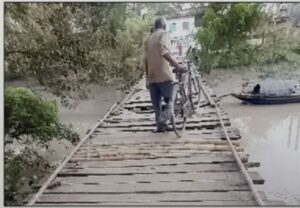 হাওড়া: গ্ৰামীণ হাওড়া জেলার শ্যামপুর ২ নং ব্লকের একটি ভগ্ন প্রায় কাঠের সেতু দিয়ে প্রাণের ঝুঁকি নিয়ে পারাপার করতে বাধ্য হচ্ছে কয়েক হাজার মানুষ।শ্যামপুর ২ নং