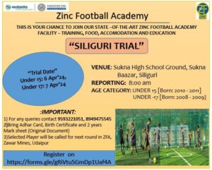 सुकना: युवा फूटबल खेलाड़ीहरूका निम्ति अझ एउटा सुनौलो मौका आएको छ। राजस्थानको चर्चित जिंक फूटबल एकाडमीले अण्डर-१५ र अण्डर-१७ आयु वर्गमा खेलाड़ीहरूका चयन गर्न सुकनामा ट्रायलको