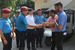 झापा: ट्राफिक ब्यबस्थापनको सहजताका लागि ईटहरीमा रहेको अटो सिटि बजाज सोरुमका संचालक प्रदिप कुमार सन्थालियाले ट्राफिक पुलिसलाई ४ थान बिद्युतिय टेम्पो प्रदान गरेका छन। नेपाल पुलिस