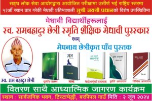 सोनादा: टिस्टाभेल्लीमा मेधावी विद्यार्थीहरूलाई स्व रामबहादुर छेत्री स्मृति शैक्षिक मेधावी पुरस्कारसँगै मेघनाथ छेत्रीकृत पाँचवटा पुस्तक वितरण एवम् आध्यात्मिक जागरण समारोह सम्पन्न हुने भएको छ। सोनादा डिग्री