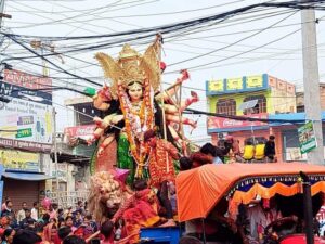 जलेश्वर: महोत्तरीको जलेश्वर नगरपालिका-२ स्थित दुर्गा चोकमा बडादसैँमा पूजाको लागि निर्माण गरिएको दुर्गा भवानीको मूर्ति आज विसर्जनको लागि लैजाँदै भक्तजनहरुको रौनक हेर्न लायकको थियो।