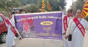जलपाईगढी: विश्व शान्तिको लागि प्रार्थना गर्ने उद्देश्यले ब्रह्माकुमारी ईश्वरीय विश्वविद्यालयद्वारा मैनागढी शहरमा रंगीन शोभायात्रा निकालियो। भोलिदेखि माध्यमिक परीक्षा शुरु हुँदैछ, त्यसैले यो जुलुस माइक बिना नै