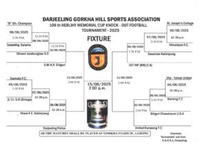 दार्जीलिङ: दार्जीलिङ गोर्खा हिल स्पोर्ट्स एसोसिएशन (डीजीएचएसए) को तत्त्वावधानमा प्रतिष्ठित हर्ली मेमोरियल कप नक्आउट फूटबल टुर्नामेण्टको १०९औं संस्करण ५ अगस्तदेखि शुरु हुनेछ। टुर्नामेण्टमा जम्मा १६ वटा