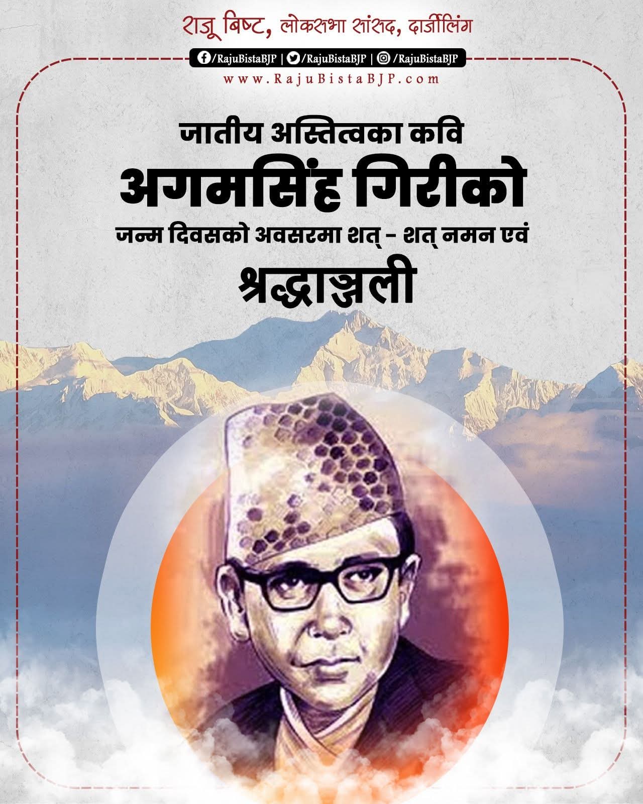 दार्जिलिङ: दार्जिलिङ लोकसभा सांसद राजु विष्टले गोर्खा जातिका जातीय अस्तित्वका कवि अगमसिंह गिरीलाई गोर्खा अस्तित्वको धरोहरको रुपमा लिंदै कविको जन्मजयन्तीमा सयौँ नमन र हार्दिक श्रद्धाञ्जली व्यक्त
