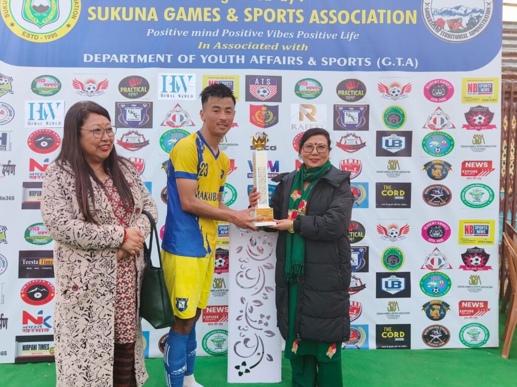 सुकना: सुकना गेम्स एण्ड स्पोर्ट्स एसोसिएशनको आयोजन अनि युवा मामिला एवम् खेलकुद विभाग, जीटीए-को सहयोगमा जारी सुकना गोल्ड कप फूटबल टुर्नामेण्टको १७औं संस्करणमा युनाइटेड खरसाङ फूटबल क्लब (यूकेएफसी)-ले सजिलै म्याच जितेर सेमिफाइनलमा स्थान बनायो । शनिवार सुकना हाई स्कूल खेल मैदानमा भएको टुर्नामेण्टको पहिलो क्वार्टर फाइनल म्याचमा यूकेएफसी-ले एनएमएससी शिलोंगलाई ३-१-ले पराजित गऱ्यो। विजेता टीमबाट नयन प्रधानले ह्याट्रिक गरे। उनले १४औं, ३२औं र ७७औं मिनटमा गोल गरे। यसरी शिलोंगको टीमबाट द्लेशिंग लिंगदोहले ८९औं मिनटमा गोल गरे। नयन प्रधानलाई प्लेयर अव् द म्याच चयन गरियो। अब आइतवार खेलिने दोस्रो क्वार्टर फाइनल म्याचमा कालेबुङ पुलिस र असमको इलेभेन स्टार क्लब, बोंगगाईगाउँबीच भिड़न्त हुनेछ। टुर्नामेण्टमा २० वटा शीर्ष टीमले हिस्सा लिएको छ। संशोधित कार्यक्रम अनुसार दुईवटा सेमिफाइनल २४ र २५ जनवरीमा खेलिनेछ। यसरी फाइनल २७ जनवरीमा हुनेछ।
