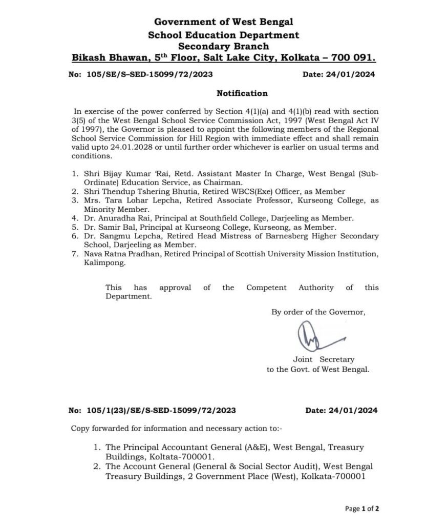 दार्जीलिङ: जीटीए क्षेत्रको निम्ति अलग्गै क्षेत्रीय विद्यालय सेवा आयोग (Regional School Service Commission) को गठन गरिएको भागोप्रमोले जानकारी गराएकोछ। उक्त नयाँ कमिसनका पहिलो अध्यक्ष बिजयकुमार राई बनेको पनि जनाएको छ। पश्चिम बंगाल विद्यालय सेवा आयोग अधिनियम, १९९७ (१९९७ को पश्चिम बंगाल अधिनियम IV) को ३(५) को आधारमा पहाडी क्षेत्रको निम्ति अलग्गै क्षेत्रीय विद्यालय सेवा आयोग (Regional School Service Commission) को गठन भएको अधिसूचना पश्चिम बंगाल सरकार, स्कूल शिक्षा विभागले जारी गरेको छ। (सूचना नम्बर: १०४/१(२३)/एसयी/एसयीएड-१५०९९/७२/२०२३, मिति: २४/०१/२०२४) कमिसनको सञ्चालन गर्न निम्न सदस्यहरूलाई तत्काल नियुक्ति दिइएको छ। सदस्यहरूको सदस्यताको मियाद २४ जनवरी २०२८ सम्म रहेको छ। उक्त कमिशनमा बिजयकुमार राई, अध्यक्ष सेवानिवृत्त सहायक मास्टर इन्चार्ज, पश्चिम बंगाल (उप-आदेश) शिक्षा सेवा, थेण्डुप छिरिङ भुटिया, सदस्य, सेवानिवृत्त डब्ल्यूबीसीएस (पूर्व) अधिकारी, तारा लोहार लेप्चा, अल्पसंख्यक सदस्यको रूपमा, सेवानिवृत्त सहयोगी प्राध्यापक, खरसाङ कलेज, डा. अनुराधा राई, सदस्य, साउथफिल्ड कलेज, दार्जिलिङका प्रचार्य, डा समीर बल, सदस्य, प्राचार्य, खरसाङ कलेज, खरसाङ, डा. साङ्मु लेप्चा, सदस्य, बार्नेसबर्ग उच्च माध्यमिक विद्यालय, दार्जिलिङका सेवानिवृत्त प्रधानाध्यापक, नवरत्न प्रधान, सदस्य, स्कटिश युनिभर्सिटी मिसन इन्स्टिच्युट, कालेबुङका सेवानिवृत्त प्राचार्य आदि रहेका छन्। यस विषयमा भागोप्रमो अध्यक्ष एंव जीटीएको प्रमुख कार्यपाल अनित थापाले प्केस विज्ञाप्ति जारी गर्दै भने, ‘कर्म नै हाम्रो सिद्धान्त ‘बीजीपीएम – को सैद्धान्तिक विचारधारा हो। हामी व्यावहारिक राजनीति गर्छौ। हामी उपलब्धिको राजनीति गर्छौ। जुन दिन हामीलाई जनताले जीटीएको व्यवस्था सम्हाल्न लालकोठी पुर्यायो त्यही दिनदेखि हामीले चुनाव समय दिएका वचनहरूमाथि काम गर्नु थाल्यौं।’
