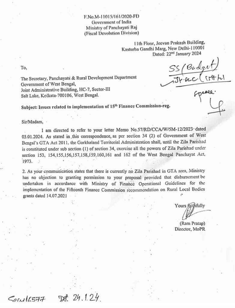 दार्जीलिङ: जीटीए एक्ट २०११ को धारा ३४(२) मा जीटीएलाई क्षेत्रमा जिल्ला परिषद स्थापित नभइन्जेलसम्म जिल्ला परिषदको भूमिका निर्वाह गर्ने शक्ति प्रदान गरिएको छ। यही प्रावधानको उपयोग गर्दै राज्य सरकारले केन्द्रका पञ्चायती राजका मन्त्रालयलाई पञ्चायती राजमा आउने रकम जीटीएमार्फत् प्रयोग गर्न पत्राचार गरेको थियो। २२ जनवरी २०२४ को दिन पञ्चायतीराज मन्त्रालय, भारत सरकारले १५औं फाइनान्स कमिसनमार्फत् जीटीए क्षेत्रका पञ्चायत क्षेत्रमा आएको रकमलाई जीटीएमार्फत चलाउने अनुमति दिएको छ। साधारण भाषामा भन्नु हो भने जीटीए क्षेत्रमा जिल्ला परिषदको भूमिका जीटीएले निर्वाह गर्नेछ।
