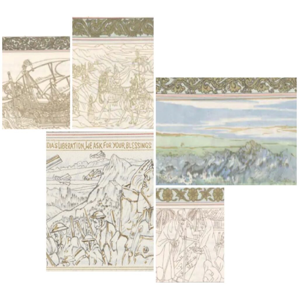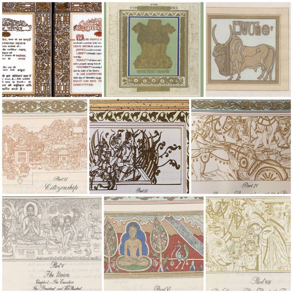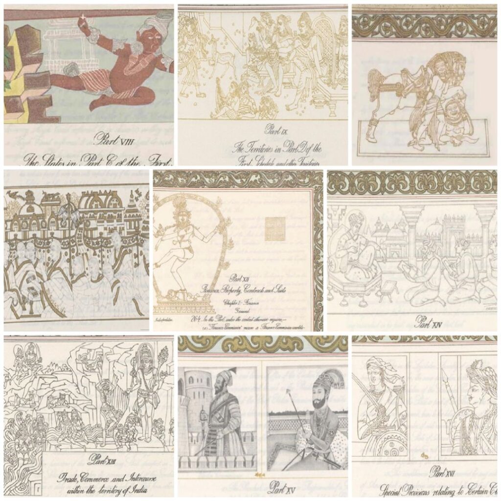 संविधानको भाग तीन, जसले मौलिक अधिकारहरूसँग सम्बन्धित छ, भगवान राम, देवी सीता र लक्ष्मणको अयोध्या फर्केको चित्र छ। संविधानको चौथो भाग कुरुक्षेत्रको चित्रबाट शुरु हुन्छ। यसमा कृष्णले अर्जुनलाई गीताको ज्ञान दिइरहेको देखिन्छ। यस भागमा राज्य नीतिका निर्देशक सिद्धान्तहरू व्याख्या गरिएको छ। संविधानको भाग पाँचमा, गौतम बुद्धले आफ्नो पहिलो उपदेश- धर्मचक्र प्रवर्तन सूत्र संघ दिनुभएको देखिन्छ। यो भाग संघ सँग सम्बन्धित छ। संविधानको छैटौं भाग २४औं जैन तीर्थङ्कर महावीरबाट शुरु हुन्छ। यो रंगीन तस्वीरमा महावीर ध्यान मुद्रामा बसिरहेका छन्। संविधानको सातौं भाग सम्राट अशोकको चित्रबाट शुरु हुन्छ। यस भागको नाम राज्यहरू (पहिलो अनुसूचीको भाग ख राज्यहरू) हो। यसमा अशोक भिक्षुहरूसँग बौद्ध धर्म फैलाउँदै गरेको देखिन्छ। संविधानको आठौं भाग हनुमानको चित्रबाट सुरु हुन्छ। यस भागको नाम राज्यहरू (पहिलो अनुसूचीको भाग सीको राज्यहरू) हो। तस्वीरमा हनुमान सीताको खोजीमा लंका तर्फ उडिरहेका छन्।