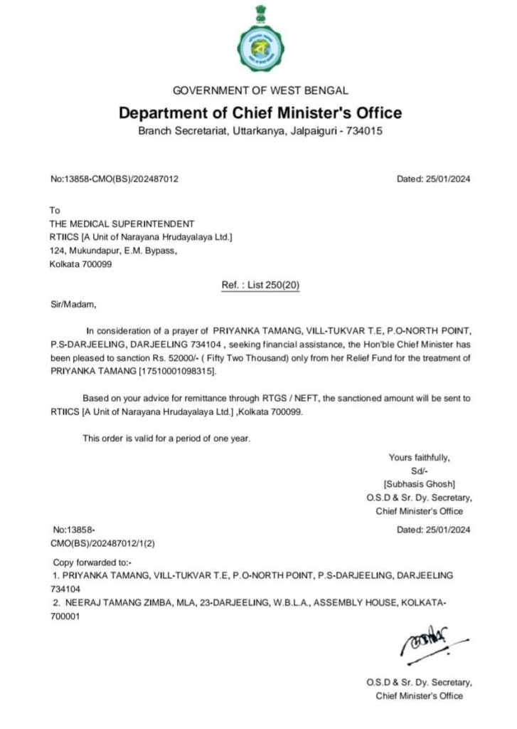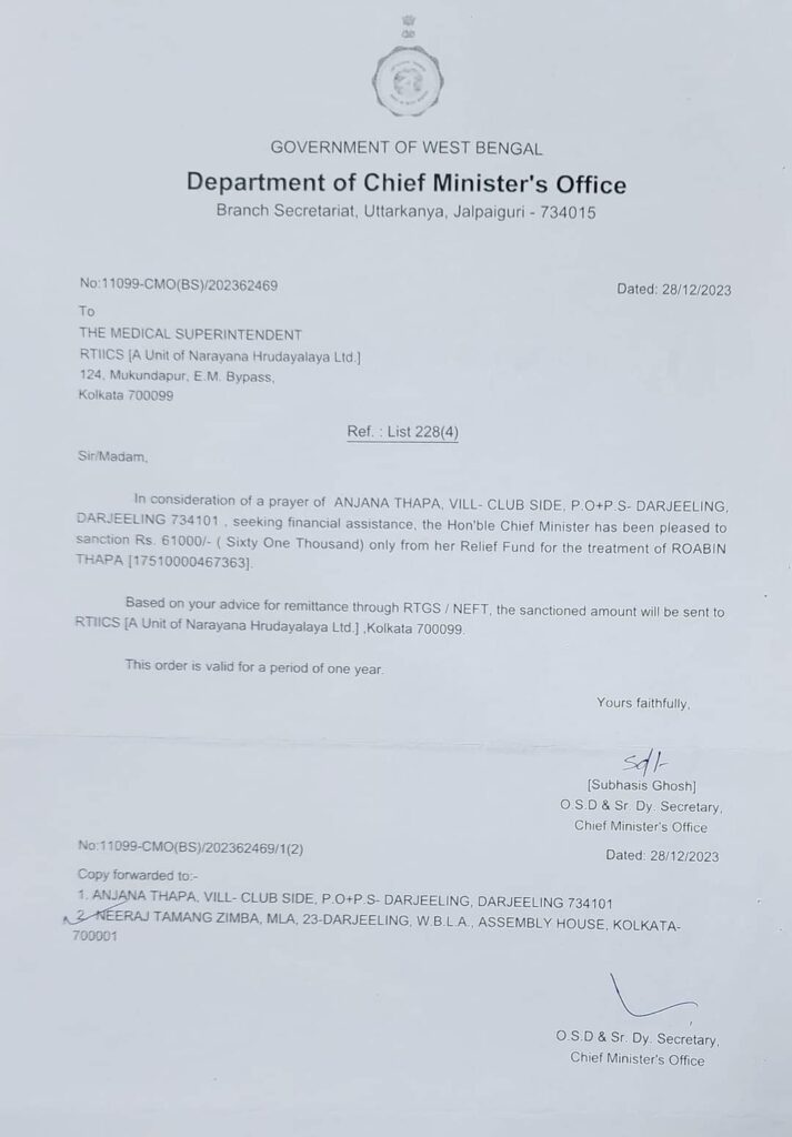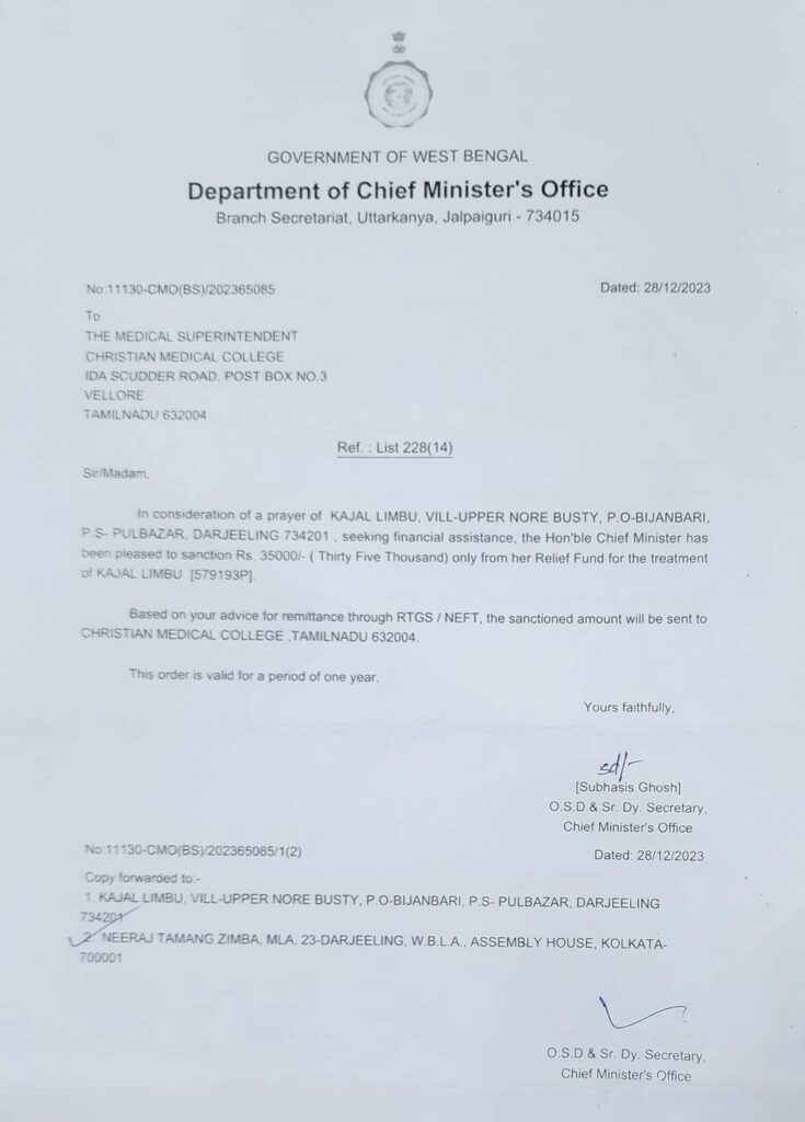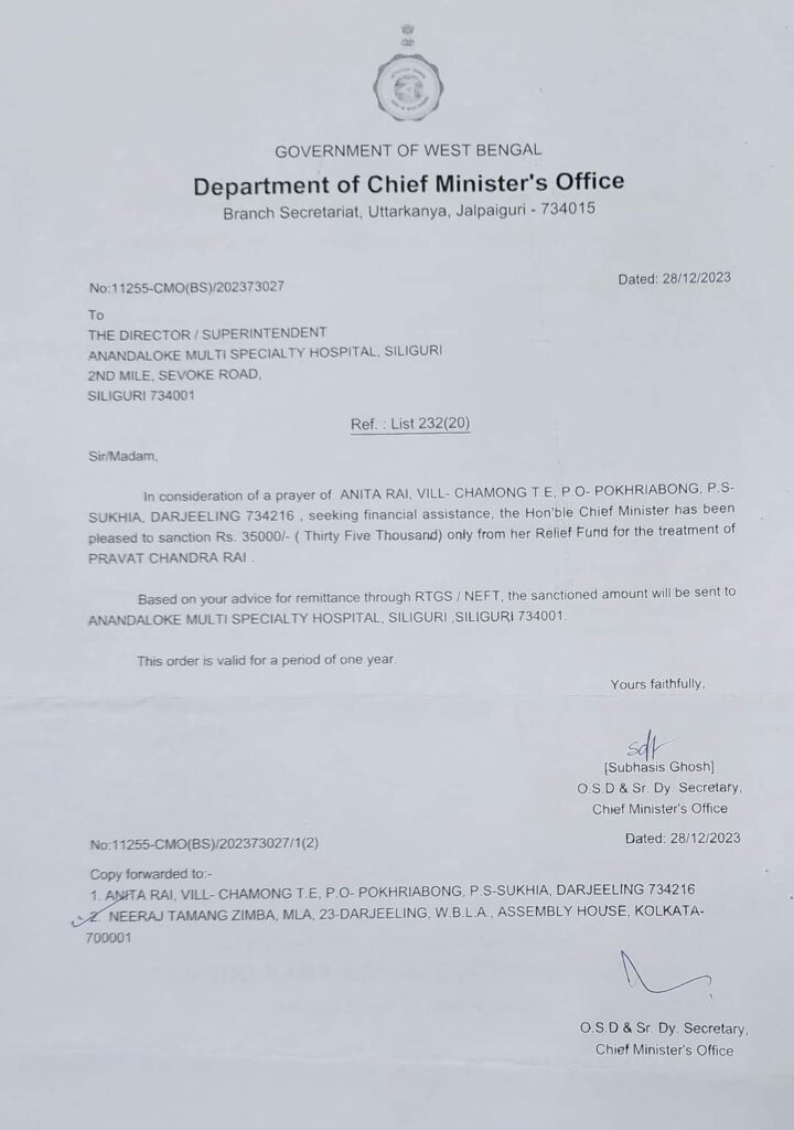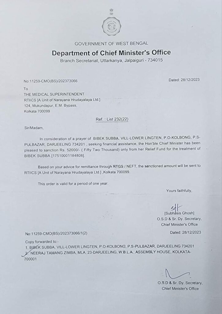 दार्जिलिङ: दार्जीलिङ विधानसभा क्षेत्रका विभिन्न रोगबाट पीडित रोगीहरुलाई विधायक जिम्बाको कोषबाट आर्थिक सहयोग प्रदान गरिएको छ। दार्जीलिङ विधानसभा क्षेत्रका विधायक निरज जिम्बामार्फत आफ्नो विधानसभा क्षेत्रमा बिरामीहरुलाई उपचारको निम्ति मुख्यमन्त्री राहत कोषबाट आर्थिक सहयोग प्रदान गरिरहेका छन्। विभिन्न अस्पताल अनि नर्सिङ होमहरुमा उपचार गराइरहेका पाँचजना बिरामीहरुलाई उपचारको निम्ति आर्थिक सहायता पाउनेहरु दार्जीलिङ टकभर चियाबारी निवासी प्रियंका तामाङले ₹.५२,०००/- राशि सहयोग प्राप्त गरेका छन्। दार्जीलिङ क्लब साइड निवासी अन्जाना थापाले उनको पति रबिन थापाको उपचारको निम्ति ₹.६१,०००/- आर्थिक सहयोग प्राप्त भएका छन्। यस सहयोगको निम्ति पीडित परिवारले विधायक निरज जिम्बाप्रति आभार व्यक्त गरेका छन्। पुलबजार, लोवर लिङटेन कोलबुङ निवासी बिबेक सुब्बाले उपचारको निम्ति ₹५२,०००/- आर्थिक सहयोग प्राप्त गरेका छन् पोख्रेबुङ, चामुङ चियाबारी निवासी अनिता राईले पनि आफ्नो उपचारको निम्ति ₹३५,०००/- सहयोग राशि प्राप्त गरेका छन् । यसै क्रमा सुके पोखरी निवासी दीप गिरीले आफ्नो उपचारको निम्ति ₹५२,०००/- आर्थिक सहयोग प्राप्त गरेका छन्। पुलबजार बिजनबारी, अप्पर नुर बस्ती निवासी काजल लिम्बुले ₹३५,०००/- आर्थिक सहयोग राशि प्राप्त गरेका छन्। विधायक निरज जिम्बाद्वारा बिरामीहरुको शीघ्र स्वस्थ्य लाभको पनि कामना गरेका छन्।