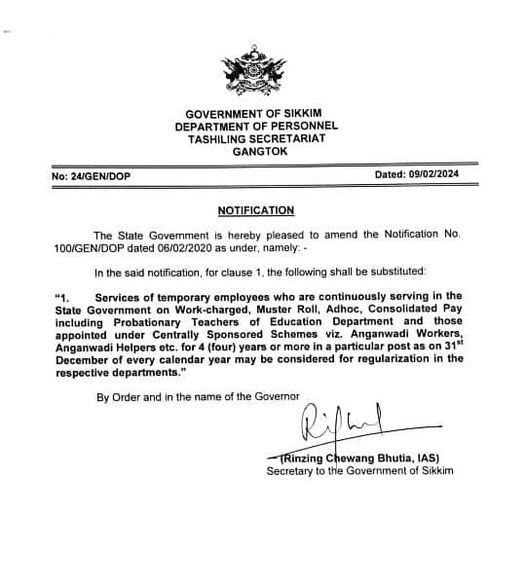 गान्तोक: सिक्किम सरकारले राज्यका अस्थायी तथा २००६ पछि स्थायी बनेका कर्मचारीको हितलाई ध्यानमा राखेर विभिन्न अधिसूचना जारी गरेको छ। सरकारको कार्मिक एवं प्रशिक्षण डीओपी विभागले रम्फूमा आयोजन गरेको अस्थायी कर्मचारी भरोसा सम्मेलनको अवसरमा मुख्यमन्त्री पीएस गोलेले कर्मचारीको पक्षमा विभिन्न लाभकारी योजनाका अधिसूचना जारी गरे। सरकारले २००६ पछि स्थायी कर्मचारीको पक्षमा पुरानो पेन्सन पुनर्बहालीको अधिसूचना जारी गरेको छ। यसरी नै ३१ दिसम्बर, २०२३ मा चार वर्षको सेवाकाल पूरा गरेका सबै अस्थायी सरकारी कर्मचारीलाई स्थायी गराउने अधिसूचना मुख्यमन्त्रीले जारी गरे। नयाँ अधिसूचना अनुसार, अब सिक्किम सरकार अधीनस्थ विभागमा काम गर्ने दिव्याङ्ग कर्मचारीलाई दुई वर्षको सेवाकाल पूरा गरेपछि स्थायी गरिनेछ। यसरी नै जमिनदान दिएर नियुक्ति पाएका अस्थायी कर्मचारीलाई स्थायी गराउने र वन विभाग अन्तर्गत विभिन्न पदको सिर्जना गर्ने अधिसूचना पनि मुख्यमन्त्रीले आजको सम्मेलन अवसरमा जारी गरे।