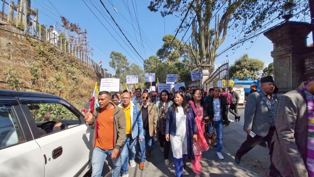 कालेबुङ: गोर्खाहरूका लागि भाजपाले आफ्नो संकल्प पत्रमा उल्लेख गरेको ११ जातगोष्ठिलाई जनजातिको मान्यता प्रदान नगरेको बताउँदै भाजपाको नीतिको विरोधमा भागोप्रमोले आज १२ फरवरी, सोमबारदेखि दार्जीलिङ, खरसाङ, कालेबुङमा व्यापक विरोध प्रदर्शन शुरु गरेको छ। कालेबुङको जिल्लापाल कार्यालयअघि भागोप्रमोले भाजपाको विरोधमा धरना प्रदर्शन गर्दै नाराबाजी गऱ्यो। गोर्खाका ११ जातगोष्ठिलाई जनजातिको मान्यता प्रदान गर्नेपर्ने मागमा भागोप्रमोको एउटा प्रतिनिधि टोलीले जिल्लापालमार्फत् प्रधानमन्त्रीलाई पत्राचार पनि गरेको छ।