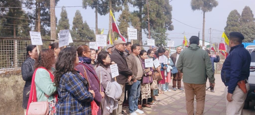 खरसाङ: भारतीय गोर्खा प्रजातान्त्रिक मोर्चाद्वारा खरसाङ खण्ड विकास कार्यालयमा विरोध प्रदर्शन गरिएको छ। भारतीय गोर्खा प्रजातान्त्रिक मोर्चा केन्द्रीय समितिका अध्यक्ष अनित थापाद्वारा पहाड़काे जनतालाई जागरुक बनाउन मिशन जागरण, अन्र्तगत आज दोस्रो दिन पनि धारावाहिक रूपमा अघि बढाउनकाे साथमा भारतीय जनता पार्टीले पहाडको जनतासँग कोल्टे राजनीति गर्दै, गोर्खा जातिको एघारवटा जात-गोष्ठीहरूलाई केन्द्र सरकारले जनजाति नदिएको भन्दै खरसाङ विकास कार्यालय अघि भागोप्रमोद्वारा विरोध प्रदर्शन गरेका छन्। भागाेप्रमो केन्द्रीय समिति नारी शक्तिका अध्यक्षा तथा खरसाङ पञ्चायत समिति सभाधिपति अनु प्रधान, उप सभापति नारायण थापा, भागोप्रमो खरसाङ महकुमा समितिका अध्यक्ष सुभास प्रधान, अनि खरसाङ टाउन कमिटीका अध्यक्ष राजु शर्मा अनि कार्यवाहक सचिव बीरबल पाखरीनकोे नेत्तृत्वमा खरसाङ खण्ड विकास कार्यालयमा विराेध प्रदर्शन गरिएको छ। उक्त विरोध प्रदर्शनमा महकुमा समितिका सभापति सुभास प्रधानले धरणा प्रदर्शनमा उपस्थित भएका सम्पूर्ण जनसाधारणलाई विरोध प्रदर्शन विषयमा लगायत भावी कार्यक्रमकाे विषयमा जानकारी दिन्दै संबोधन गरेका थिए। उक्त विरोध प्रदर्शनल्ई खरसाङ पञ्चायत समितिका उप सभापति नारायण थापा अनि खरसाङ टाउन कमिटीका सभापति राजु शर्माले वक्तव्य राख्दै उपस्थित भारतीय गोर्खा प्रजातान्त्रिक मोर्चाका सम्पूर्ण नेतृत्वलाई संगठनकाे निम्ति कार्य गरिदिने आह्वान् गरे। अन्त्यमा उपस्थित नेतृत्वगण खण्ड विकास अधिकारी कौशिक चक्रवर्तीसंग भेट गरेर विरोध प्रदर्शन विषयको जानकारी दिँदै उच्च अधिकारीसम्म खबर उनको मार्फत पुर्याई दिने आग्रह गरेका छन्।
