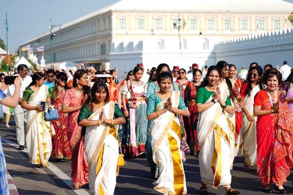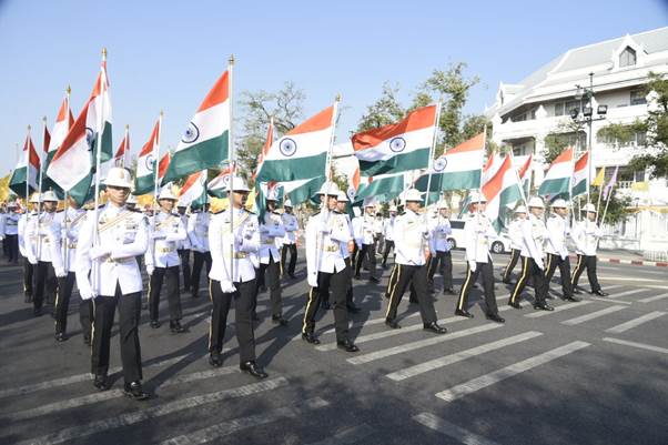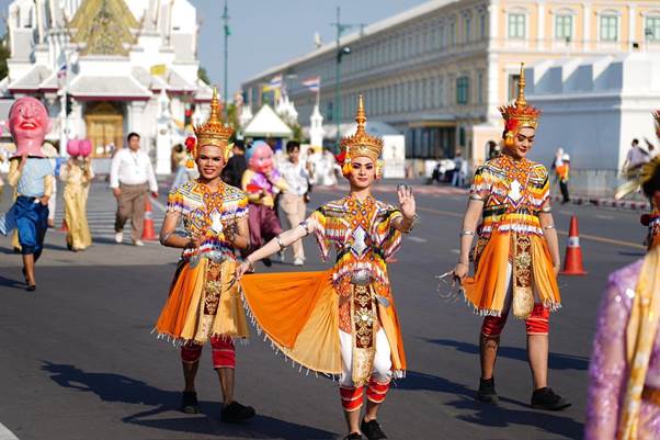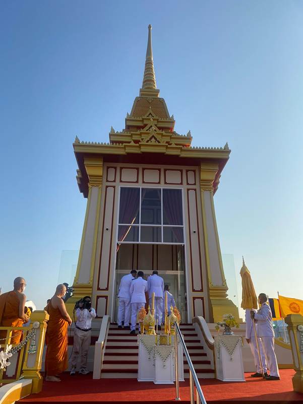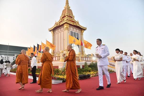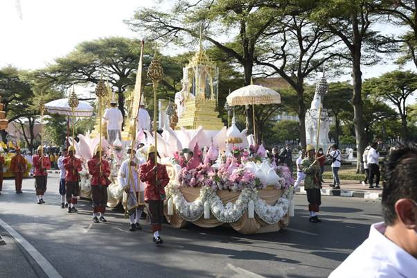 थाइल्याण्डका उपप्रधानमन्त्री सोमसाक थेप्सुटिनलाई र मण्डप स्थापनाका लागि थाइल्याण्डका संस्कृतिमन्त्रीलाई हस्तान्तरण गरे। भगवान बुद्ध र उनका दुई शिष्यका पवित्र अवशेषहरूको २६ दिने भव्य प्रदर्शनीको एक हिस्साको रूपमा ब्यांककको रोयल प्यालेस मैदानमा थाइल्याण्डको संस्कृति र सम्पदालाई देखाउँदै राष्ट्रिय संग्रहालयबाट अवशेषहरूको भव्य परेड पनि आयोजना गरिएको छ। परेडमा भारत र थाइल्यान्डबीचको सद्भाव पनि झल्काइएको थियो किनभने परेडमा दुवै देशका सांस्कृतिक प्रदर्शनीका साथै भारत र थाइल्याण्डका राष्ट्रिय झण्डाहरू समावेश थिए।