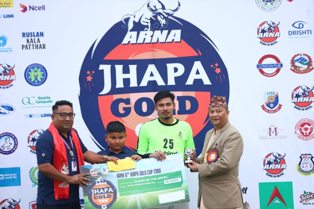 बिर्तामोड (नेपाल): टाइब्रेकरमा भाग्यमानी साबित हुँदै एपीएफ छैटौं संस्करणको झापा गोल्ड कपको उद्घाटन खेलमा विजयी भएको छ। संकटा क्लब काठमाडौंलाई ४–२ गोल अन्तरले पराजित गर्दै एपीएफले क्वाटरफाइनलको यात्रा तय गरेको हो। एपीएफका लागि दिपेश धिमाल, फोडे फोफोना, कुलदीप कार्की र सुमन श्रेष्ठले गोल गरेका थिए। संकटाका चन्दन दास र यमनबहादुर पुत्वारको प्रहारले मात्र जाली चुमेको थियो। संकटाका अजित लामाको प्रहार विपक्षी गोलरक्षकले बचाउ गरेका थिए भने मौसम सुब्बाको प्रहार गोलपोस्टमा लागेर फर्कियो।