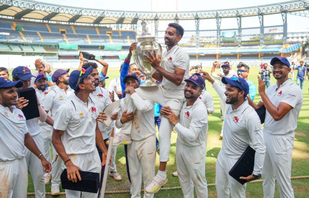 मुम्बई: मुम्बईले आठ सालको खड़ेरी समाप्त गरी आफ्नै रेकर्डमा सुधार गर्दै ४२औं पल्ट भारतको शीर्ष घरेलु क्रिकेट टुर्नामेण्ट रणजी ट्रफीको खिताब जित्यो। आयोजक मुम्बईले विदर्भलाई १६९ रनले पराजित गन्यो। टुर्नामेण्टको ९० सालको इतिहासमा मुम्बई ४८औं पल्ट फाइनलमा खेलिरहेको थियो। वानखेड़े स्टेडियममा खेलिएको फाइनलको नतीजा त्यस समय नै तय भएको थियो जब विदर्भलाई ५३८ रनको लगभग असम्भव लक्ष्य हासिल भएको थियो। चौथो दिनको स्कोर ५ विकेटमा २४८ रनदेखि अघि खेल्दै विदर्भले बिहीवार १२० रन जोड़ेर रहल ५ विकेट गुमायो। मुम्बईका बलरहरूमा तनुश कोटियनले सर्वाधिक ४ विकेट लिए। यसबाहेक तुषार देशपाण्डे र मुशीर खानले २-२ विकेट हासिल गरे। आज विदर्भका कप्तान अक्षय वाडकर (१०२ रन) र हर्ष दुबे (६५ रन)- ले पहिलो सत्रमा सक्दो लड़ाइँ गरे। अन्तमा विदर्भको टीम आज ३६८ रन बनाएर अलआउट भयो। वाडकरले यस साल पहिलो शतक बनाउनको साथै सीजनमा ६०० रनको आँकड़ा पनि पार गरे। यसरी दुबेले प्रथम श्रेणीको करियरमा दोस्रो अर्द्धशतक बनाए। यी दुईले १९४ मिनटसम्म क्रीजमा डटेर २५५ बलको सामना गरेर छैटौं विकेटको निम्ति १३० रनको पार्टनरशीप गरे। दोस्रो सीजनको खेल शुरु भएपछि केही बेरपछि वाडकरलाई तनुशले आउट गरे। यो पार्टनरशीप तोड़िनको साथै मुम्बईको काम सजिलो भयो। वाडकरले १९९ बल खेलेर ९ वटा चौका र एउटा छक्काको साध १०२ रन बनाए। विदर्भले दुईपल्ट खिताब जित्नको साथै तीनपल्ट फाइनलमा हारको सामना गर्नु परेको छ।