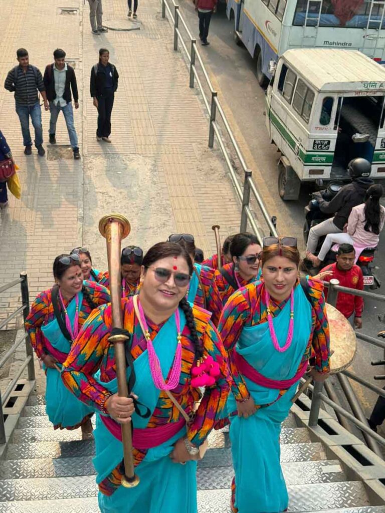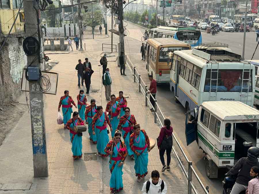 काठमाडौं: परम्परागत रुपमा पुरुषले मात्र बजाउने नौमती बाजाप्रति महिलाहरुको आकर्षण पनि बढेको देखिन्छ। बिहीबार नयाँ बानेश्वर चोकमा नयाँ वर्ष २०८१ सालको पहिलो लगनमा नौमती घन्काउन हिँडेका महिलाको समुह।