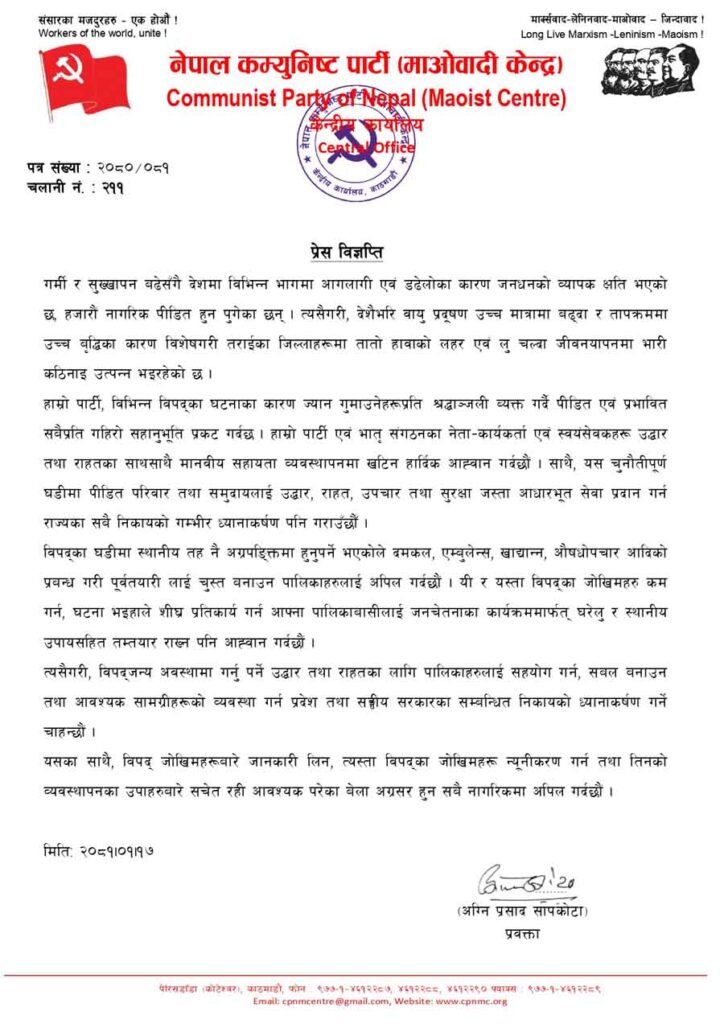काठमाडौं: नेकपा माओवादी केन्द्रले आगलागी एवं डढेलो जस्तो चुनौतीपूर्ण अवस्थामा उद्धार र सुरक्षा जस्ता आधारभूत सेवा प्रदान गर्न राज्यका सबै निकायको गम्भीर ध्यानाकर्षण गराएको छ। प्रवक्ताअग्नि प्रसाद सापकोटाले सोमबार विज्ञप्ति जारी गर्दै विपद्का घडीमा स्थानीय तह नै अग्रपंक्तिमा हुनुपर्ने भन्दै दमकल, एम्बुलेन्स, खाद्यान्न, औषधोपचार आदिको प्रबन्ध गरी पूर्वतयारीलाई चुस्त बनाउन पनि पालिकाहरुलाई अपिल गरेका छन्। ‘यस चुनौतीपूर्ण घडीमा पीडित परिवार तथा समुदायलाई उद्धार, राहत, उपचार तथा सुरक्षा जस्ता आधारभूत सेवा प्रदान गर्न राज्यका सबै निकायको गम्भीर ध्यानाकर्षण पनि गराउँछौँ ।विपदका घडीमा स्थानीय तह नै अग्रपंक्तिमा हुनुपर्ने भएकोले दमकल, एम्बुलेन्स, खाद्यान्न, औषधोपचार आदिको प्रबन्ध गरी पूर्वतयारीलाई चुस्त बनाउन पालिकाहरुलाई अपिल गर्दछौं। यी र यस्ता विपद्का जोखिमहरु कम गर्न, घटना भइहाले शीघ्र प्रतिकार्य गर्न आफ्ना पालिकाबासीलाई जनचेतनाका कार्यक्रममार्फत् घरेलु र स्थानीय उपायसहित तम्तयार राख्न पनि आह्वान गर्दछौं,’ विज्ञप्तीमा जारी गरिएको छl
