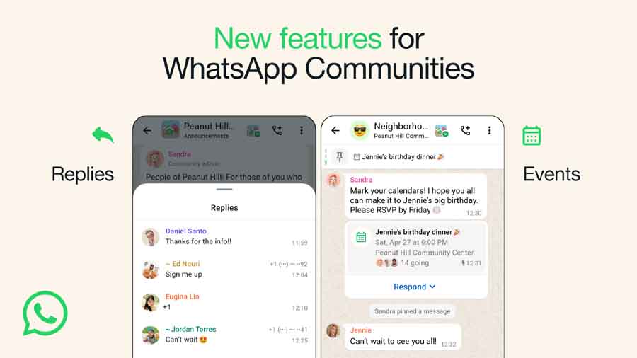 समुदायहरू शुरु गरेदेखि, साझा चासो भएका मानिसहरू, छिमेकीहरू, विद्यालय संगठनहरू, शौकहरू र थप सँगै जोडिएका अनि संगठित समूहहरू राख्नको लागि यो सुविधाको प्रयोग कसरी गर्छन् भन्ने कुरा हेर्न पाउँदा रोमाञ्चक भएको छ। समुदायहरूलाई अझ नजिक ल्याउन मद्दत गर्न, मानिसहरूलाई व्हाट्सएपमा कार्यक्रमहरू व्यवस्थित गर्ने नयाँ तरिका प्रस्तुत गर्ने बताएको छl सदस्यहरूले प्रशासकहरूबाट महत्त्वपूर्ण अद्यावधिकहरूको प्रतिक्रिया दिन सकून् भनेर घोषणा समूहहरूमा संगठित जवाफहरू शुरु गर्ने प्रेस विग्य्पतिमा बताइएको छ।