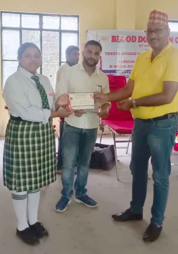 टिस्टा: आज (३१ मई) गोर्खा च्यारिटेबल हस्पिटलका र हिमालयन वेल्फेयर अर्गनाइजेसनको संयुक्त पहल अनि टिस्टा ब्रीज हायर सेकेन्डरी स्कूलको आयोजनामा रक्तदान शिविर सम्पन्न भयो। यसबारेमा गोर्खा च्यारिटेबल हस्पिटलका महासचिव तथा हिमालयन वेल्फेयर अर्गनाइजेसनका अध्यक्ष सुरेन प्रधानले जानकारी दिएका छन्l