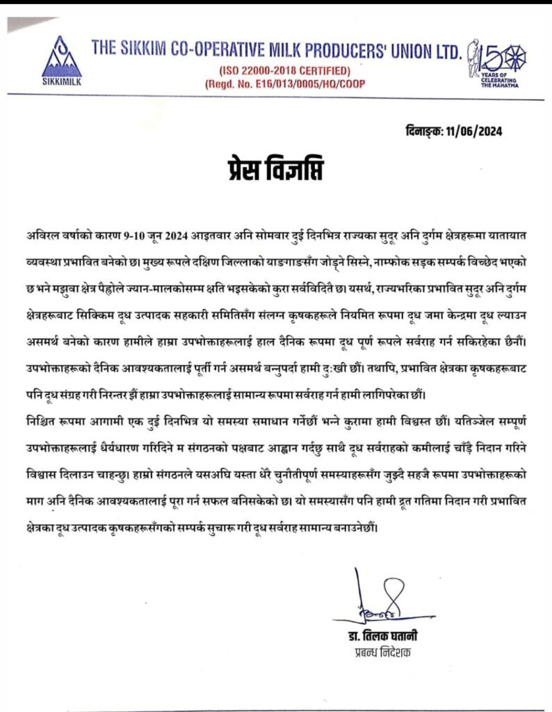 गान्तोक: अविरल वर्षाको कारण ९-१० जून २०२४ आइतवार अनि सोमवार दुई दिनभित्र राज्यका दुर्गम क्षेत्रहरूमा यातायात व्यवस्था प्रभावित बनेको छ। मुख्य रूपले दक्षिण जिल्लाको याङगाङसँग जोड़्ने सिस्ने, नाम्फोक सड़क सम्पर्क विच्छेद भएको छ भने मझुवा क्षेत्र पैह्रोले ज्यान-मालकोसम्म क्षति भइसकेको कुरा सर्वविदितै छ। यसर्थ, राज्यभरिका प्रभावित सुदूर अनि दुर्गम क्षेत्रहरूबाट सिक्किम दूध उत्पादक सहकारी समितिसँग संलग्न कृषकहरूले नियमित रूपमा दूध जमा केन्द्रमा दूध ल्याउन असमर्थ बनेको कारण उपभोक्ताहरूलाई हाल दैनिक रूपमा दूध पूर्ण रूपले सर्वराह गर्न नसकेको सिक्किम मिल्क यूनियनले जानकारी गराएको छ। उपभोक्ताहरूको दैनिक आवश्यकतालाई पूर्ती गर्न असमर्थ बनेकोमा यूनियनले दुःख प्रकट गरेको छ तथापि, प्रभावित क्षेत्रका कृषकहरूबाट पनि दूध संग्रह गरी निरन्तर झैं उपभोक्ताहरूलाई सामान्य रूपमा सर्वराह गर्न हामी लागिपरेको बताएको छ। निश्चित रूपमा आगामी एक दुई दिनभित्र यो समस्या समाधान हुन सक्ने आशा व्यक्त गरेको छ। यतिञ्जेल सम्पूर्ण उपभोक्ताहरूलाई धैर्यधारण गरिदिने सिक्किम मिल्क यूनियनका प्रबन्धक निर्देशक तिलक घतानीले एक विज्ञप्ति जानकारी गर्दै बताएका छन्। संगठनको पक्षबाट उनले दूध सर्वराहको कमीलाई चाँड़ै निदान गरिने विश्वास दिलाएका छन्। सिक्किम मिल्क यूनियनले यसअघि यस्ता धेरै चुनौतीपूर्ण समस्याहरूसँग जुझ्दै सहजै रूपमा उपभोक्ताहरूको माग अनि दैनिक आवश्यकतालाई पूरा गर्न सफल बनको उनको दावी गरेका छन्।