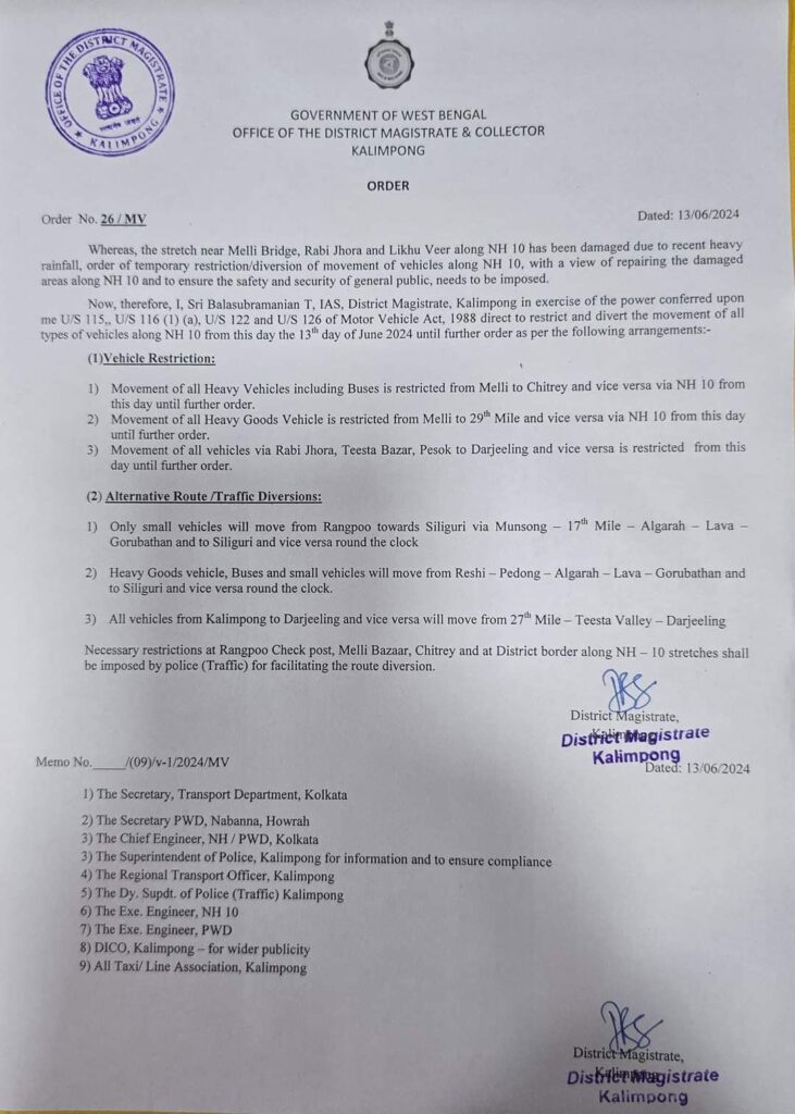 कालेबुङ: कालेबुङ जिल्ला शासक कार्यालयद्वारा आज एउटा निर्देशिका जारी गरेर आजबाट अघिल्लो निर्देश नआएसम्म हाइवे-१० बन्द रहने बताएको छ। भारी वर्षाको कारण मल्ली पुल नजिकै रवि झोडा र लिखु भीर नजिकको भाग क्षतिग्रस्त भएको छ। उक्त क्षतिग्रस्त क्षेत्रहरू मरम्मति गर्ने उद्देश्यका साथ हाइवे १० मा वाहनहरूको आवागमनमा अस्थायी प्रतिबन्ध लगाउनको साथै आम जनताको सुरक्षा सुनिश्चित गर्न नयाँ मार्गबाट वाहनहरू चलाउने निर्देश दिएको छ।