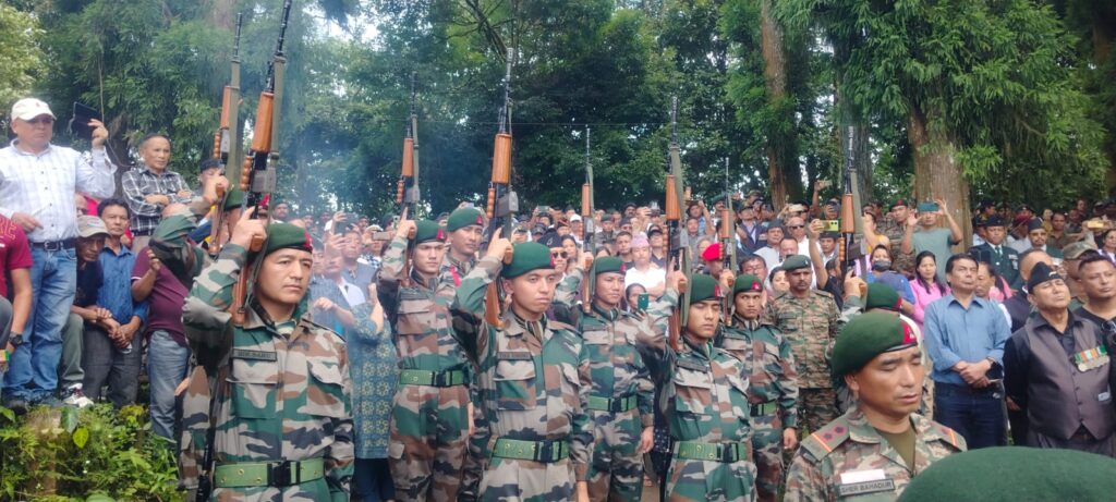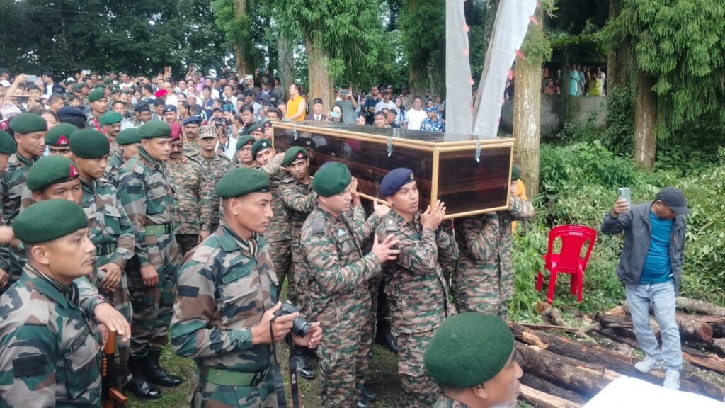 दार्जिलिङ: शहीद कप्तान ब्रिजेस थापाको आज सैनिक सम्मानको साथमा अन्तिम संस्कार गरिएको छ। जम्मु कश्मीरको डोडा जिल्लामा आतंककारीसितको लडाईमा देश रक्षामा शहीद बनेका गोर्खा सपुत शहीद कप्तान ब्रिजेस थापाको पार्थिव शरीरलाई हिजो उनको पैतृक गाउँ दार्जिलिङको बड़ा गिङ्ग ल्याइएको थियो भने आज बिहान अन्तिम संस्कार गरिएको छ। आफ्नो पैतृक थलोमा गाउँलेहरू, आफन्तहरू, विभिन्न संघ संस्थाहरू साथै भूतपूर्व सैनिक संगठनको प्रतनिधिहरू लगायत भारतीय सेनाको जवानहरूले सैनिक सम्मानको साथमा शहीद कप्तान ब्रिजेस थापाको अन्तिम संस्कार गरिएको छ। शहीद कप्तान ब्रिजेस थापालाई उनको परिवार, आफान्तजन, गाउँलेहरू र अन्यहरूले अश्रुपूर्ण अन्तिम बिदाई दिएका छन्। शहीद कप्तान ब्रिजेस थापाको अन्तिम संस्कारको समयमा परिवारको पक्षमा पिता अवकाशप्राप्त कर्नल भुवनेशकुमार थापा, माता, बहिनी र अन्यहरू उपस्थित रहेका थिए।