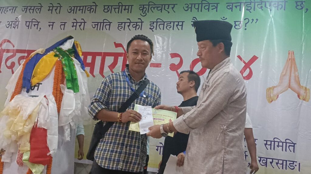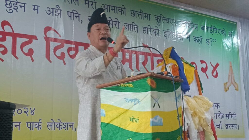 खरसाङ: गोर्खा जनमुक्ति मोर्चाले आज खरसाङमा गोर्खाल्याण्ड आन्दोलनमा शहीद भएका शहीदहरूलाई श्रध्दाञ्जली अर्पण गर्नलाई केन्द्रीय स्तरमा शहीद दिवस समारोहको आयोजना गरेको छ। खरसाङको पार्क लोकेशनस्थित सार्वजनिक भवनमा सम्पन्न उक्त शहीद दिवस कार्यक्रमको अध्यक्षता खरसाङ निवासी तथा गोजमुमो केन्द्रीय सांगठनिक सचिव शरण देवानको अध्यक्षतामा सम्पन्न भएको छ। कार्यक्रमलाई गोजमुमो खरसाङ महकुमा समितिको सचिव रोहित स्याङ्बोले सञ्चालन गरेका थिए। यस शहीद दिवस कार्यक्रममा स्वागत सम्भाषण गोजमुमो केन्द्रीय सह सचिव बिमल दर्जी र जीटीएको पूर्व चेयरम्यान प्रदीप प्रधानले राखेका थिए। कार्यक्रममा गोजमुमो केन्द्रीय महासचिव रोशन गिरी, दार्जिलिङका सांसद राजु विष्ट, प्रमुख अतिथि गोजमुमो अध्यक्ष बिमल गुरुङ आदिले वक्तव्य राखेका थिए। कार्यक्रममा मञ्चमा नै बनाइएको शहीद वेदीमा उपस्थित अतिथिहरूका बाहुलीबाट शहीदहरूलाई श्रध्दाञ्जली अर्पण गरिएको थियो।