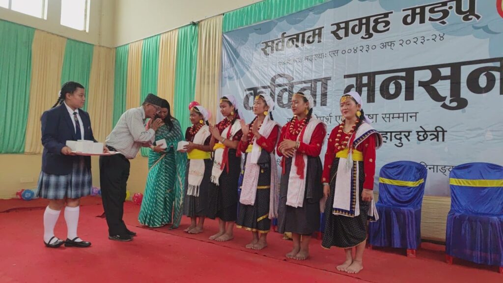 मङ्पू: आज मङ्पू सरस्वती विधालय भवनमा ए के गुरुङको अध्यक्षतामा सर्वनाम समुहको आयोजनामा “कविता मसुन” समारोह सप्पन्न भयो। समारोहका प्रमुख अतिथि डा. हर्कबहादुर छेत्री उपस्थिति थिए। संस्थाका सदस्य प्रमीला मुखियाद्वारा संचालित कार्यक्रममा स्वागत सम्भाषाण पुष्कर सिङगर राखे। यस कार्यक्रममा मङ्पूकी गायिका गरिमा गुरुङले आफ्नो सुन्दर गीत प्रस्तुत गरिन्।