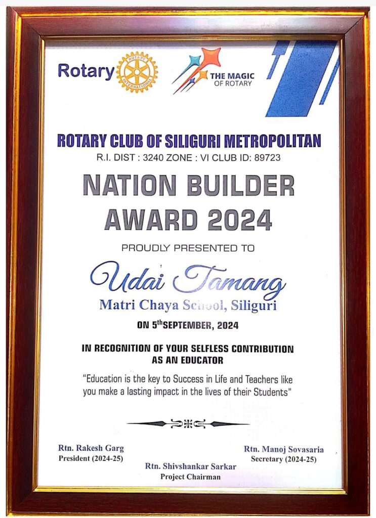 गोरुबथान: इन्टरनेसनल रोटरी अर्गानाइजेसनको तर्फबाट रोटरी क्लब अफ सिलगढी मेट्रोपोलोटियनको तर्फबाट शिक्षक दिवसको अवसरमा नेसनल बिल्डर अवार्ड यसपटक स्पेसल टिचरहरुलाई प्रदान गरिएको थियो।स्पेशल टिचरहरुले दिव्याङ्ग विद्यार्थीहरु लगायत नर्मल विद्यार्थीहरुलाई शिक्षा प्रदान गरिरहेका स्पेशल टिचरहरुलाई प्रदान गरियो। यस कार्यक्रममा गोरुबथानबाट उदय तामाङलाई पनि प्रमाण पत्र तथा उपहार प्रदान गरियो।उदय तामाङ गोरुबथान तामाङ गाउँ निवासी हुन्। उनलाई विगत ३ डिसेम्बर २०२१ सालमा पश्चिम बंगाल सरकारको तर्फबाट स्टेट अवार्डले सम्मानित गरिएको थियो।
