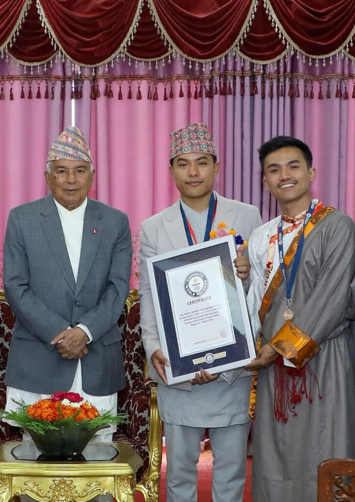काठमाडौं: राष्ट्रपति रामचन्द्र पौडेलले राष्ट्रपति भवन शीतल निवासमा सुरेन्द्र राई र सुसन तामाङलाई गिनिज वर्ल्ड रेकर्ड्सको प्रमाणपत्र प्रदान गरेका छन्। सुरेन्द्र र सुसनले विश्वमै पहिलोपटक उच्चतम स्थानमा डान्स कोरियोग्राफी गर्दै ‘गिनिज बुक अफ वर्ल्ड रेकर्ड्स’ मा आफ्नो नाम दर्ज गरेका हुन्। सोलुखुम्बुस्थित काला पत्थरमा ५,४४१ मिटर (१७,८५१ फिट) उचाइमा १९ मई २०२४ (नेपाली मिति जेठ ६) मा यस कीर्तिमान प्रयासलाई सफलतापूर्वक सम्पन्न गरेका थिए। उनीहरूले प्रस्तुत गरेको नृत्य ‘मन मगन’ बोलको गीतमा साढे दुई मिनट लामो थियो। यो रेकर्ड नेपाललाई विश्वमा चिनाउने र पर्यटन प्रवर्द्धन गर्ने उद्देश्यले गरिएको हो।