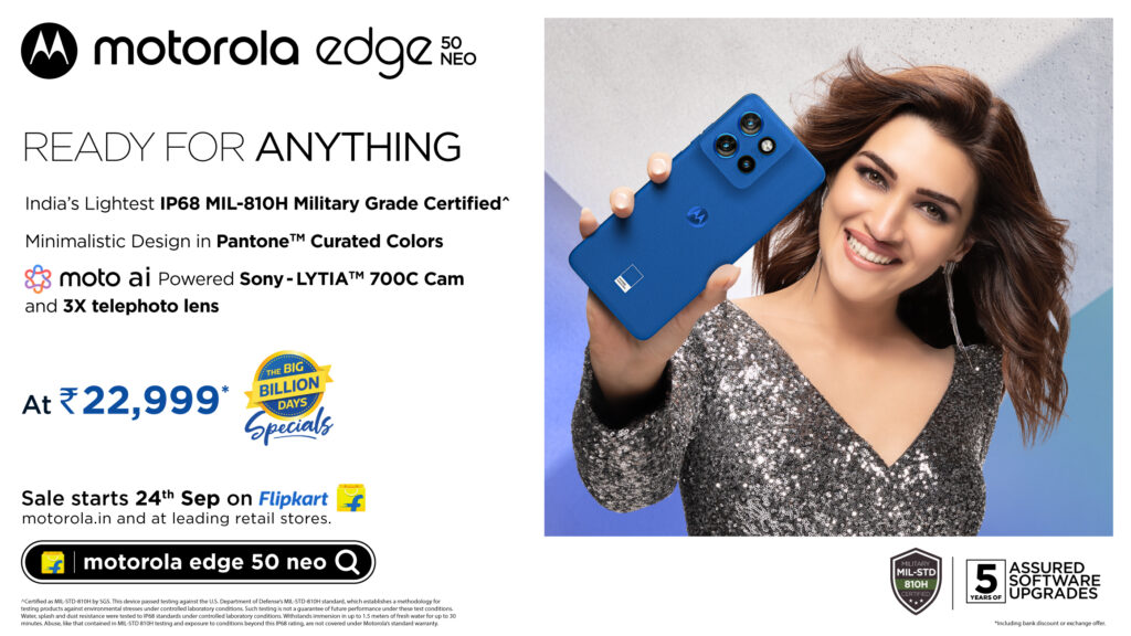 प्रक्षेपणमा बोल्दै मोटोरोला इण्डियाका प्रबन्ध निर्देशक टी एम नरसिंहनले भने, ‘हामी एज५० नियो, जुन आईपी६८ अन्डरवाटर प्रोटेक्शन र एमआईएल ८१० एच मिलिटरी-ग्रेड प्रमाणीकरणको एक अद्वितीय मिश्रण हो, एज५० नियो सेटहरू लन्च गर्न अत्यन्तै उत्साहित छौं। यसको अचम्मको डिजाइन र प्यान्टोन क्युरेटेड रङहरूका साथै अल्ट्रा-प्रिमियम सुपर एचडीको साथमा ५०एमपी एआई-संचालित क्यामेराको साथमा एलटीपीओ डिस्प्ले धेरै खण्डका अग्रणी सुविधाहरूको साथ आउँछ, जसले मूल्य अभिवृद्धि गर्ने हाम्रो प्रतिबद्धतालाई झल्काउँछ शैली, कार्यसम्पादन र मजबुतताको संयोजन गरेर हाम्रा ग्राहकहरूका लागि आविष्कारहरू यसको सिमलेस एकीकरणको साथ, यो स्मार्टफोनले उत्कृष्ट अनुभवको सन्दर्भमा पनि नयाँ उदाहरण स्थापित गर्नेछ।‘