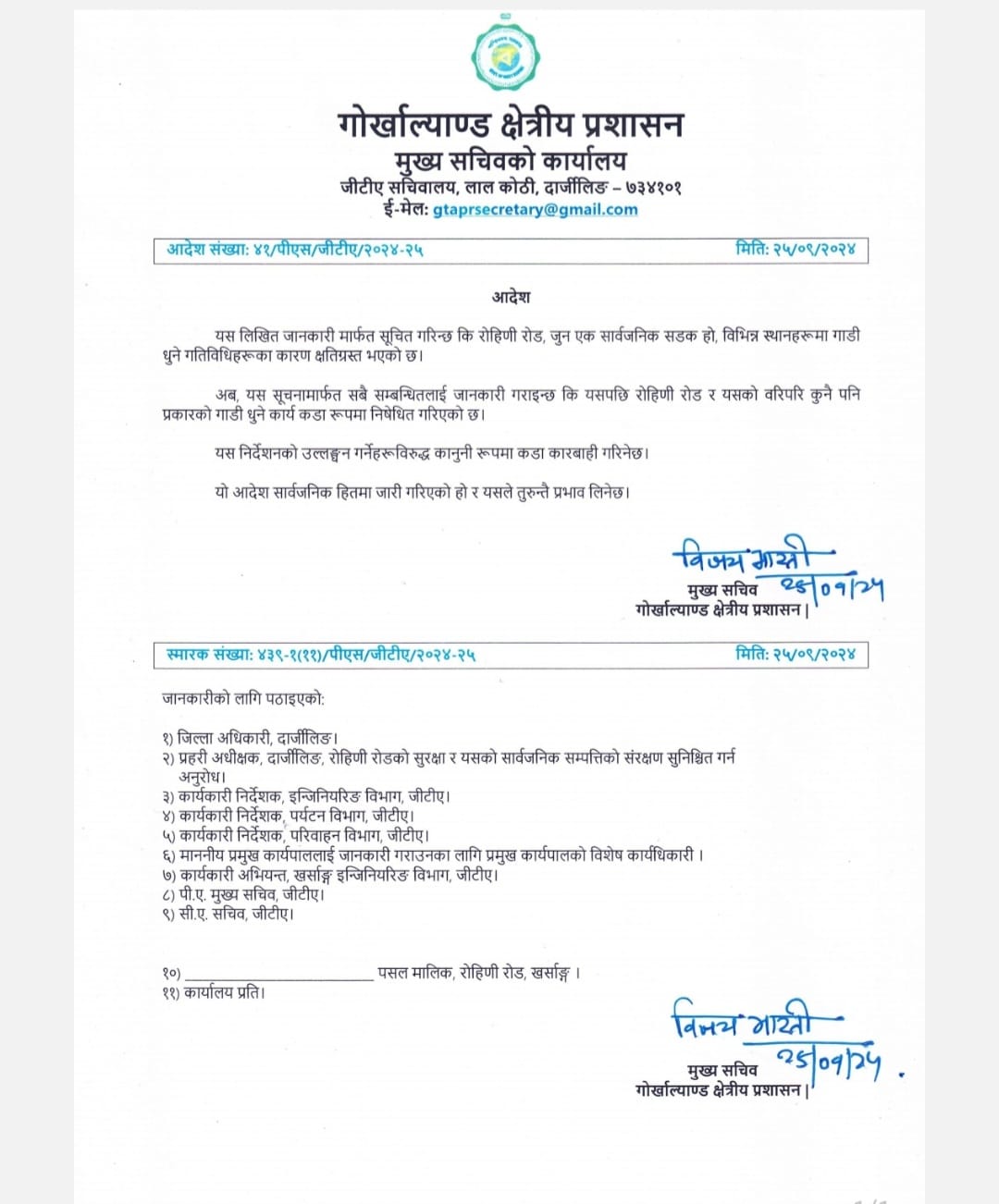 दार्जिलिङ: गोर्खाल्याण्ड क्षेत्रीय प्रशासनका मुख्य सचिवको कार्यालयबाट सम्प्रेषित अर्डरमा भनिएको छ कि रोहिणी रोग सार्वजनिक सडक हो। यस क्षेत्रमा जथाभावी सवारीसाधन धुँदा विभिन्न ठाउँमा क्षति पुगेको जानकारी आएको छ। त्यसर्थ, अबदेखि रोहिणी रोड र यस वरपरका क्षेत्रमा कुनै पनि प्रकारका सवारी साधन धुन पूर्ण निषेध गरिएको छ। यस निर्देशनको उल्लंघन गरेमा कानून बमोजिम कडा कार्बाही गरिनेछ। यो आदेश सार्वजनिक हितमा जारी गरिएको हो र तुरुन्त लागू हुनेछ भनी बताइएको छ।