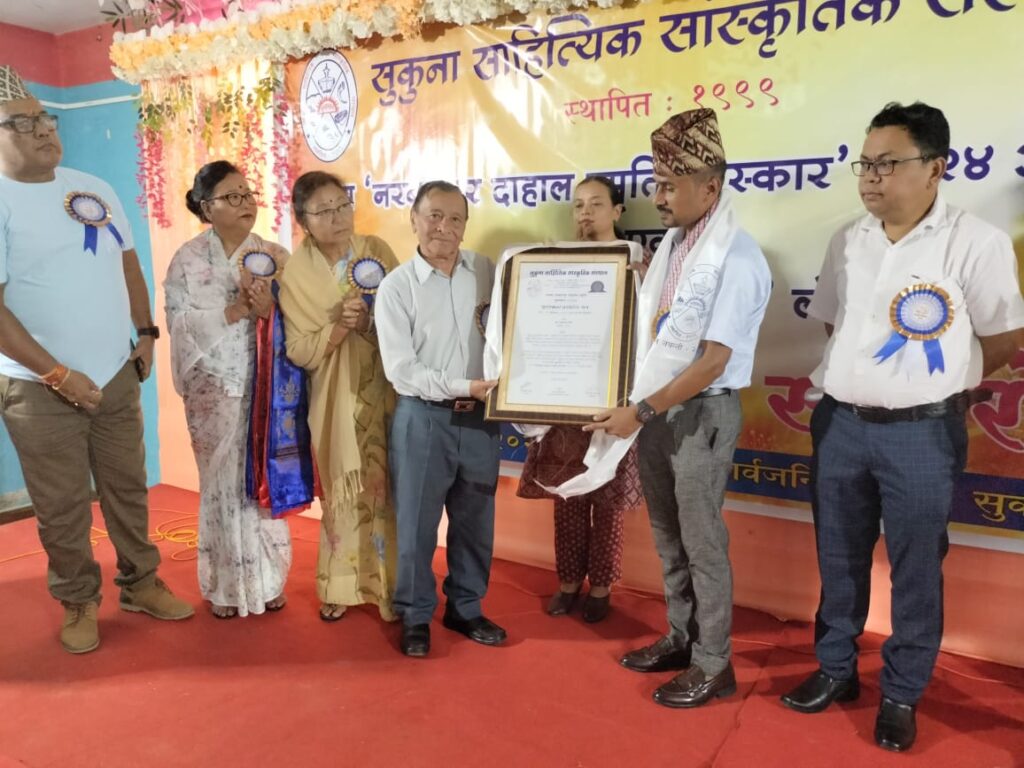 सोनादा : सुकना साहित्यिक सांस्कृतिक संस्थानको रजत जयन्ती एवम् संस्थानद्वारा शुरू गरेको प्रथम नरबहादुर दाहाल स्मृति पुरस्कार अलङ्करण समारोह सुकना खण्ड दुईस्थित सार्वजनिक भवनमा वरिष्ठ साहित्यकार डा गोकुल सिन्हाको अध्यक्षतामा एवम् वरिष्ठ आख्यानकार विन्द्या सुब्बाको प्रमुख आतिथ्यमा सम्पन्न भयो। यस अवसरमा फूलाङ्गे उपन्यासको निम्ति युवा सर्जक लेखनाथ छेत्रीलाई प्रथम नरबहादुर दाहाल स्मृति पुरस्कार 2024 प्रदान गरिएको छ। यस अन्तर्गत उनलाई नगद एघार हजार एक सय एक रुपियाँ, स्मृति चिन्ह, सम्मान पत्र, अङ्ग वस्त्र, शिरशोभा आदि प्रदान गरिएको थियो। उक्त पुरस्कार नरबहादुर दाहालका ज्येष्ठ सुपुत्र युवराज दाहालका परिवारले प्रदान गरेका थिए। समारोहका अध्यक्ष, प्रमुख अतिथि र विशिष्ट अतिथिहरूको बाहुलीबाट सो पुरस्कार दिएका थिए। पुरस्कार प्रापक लेखनाथ छेत्रीले आफ्नो सम्बोधनमा आफूले प्रथम नरबहादुर दाहाल स्मृति पुरस्कार प्राप्त गर्नु आजसम्मको सबैभन्दा ठूलो उपलब्धि रहेको र यस पुरस्कारले भविष्यमा अझ ठूल्ठूला उपलब्धिहरू हाँसिल गर्ने प्रेरणा प्राप्त गरेको कुरो उनले बताए। पुरस्कार नगद राशिले होइन तर पुरस्कार आफैआफमा बहुमूल्य हुने कुरो समारोह अध्यक्ष डा गोकुल सिन्हाले व्यक्त गरेका थिए। उनले नरबहादुर दाहाल जस्ता साहित्यिक महारथिको स्मृतिमा यसरी पुरस्कारको प्रचलन शुरु गरेर उनलाई श्रद्धाञ्जली दिने काम गरेकोमा सुकना साहित्यिक सांस्कृतिक संस्थानको सराहना गरे। संस्थानद्वारा प्रकाशित रजत जयन्ती स्मारिकाले सुकनाको इतिहास बोक्न सकेको अनुभव भएको उनले जनाए। डा सिन्हाले लेखनाथ छेत्रीकृत फुलाङ्गे बारेमा पनि चर्चा गरे। प्रमुख अतिथि विन्द्या सुब्बाले आफ्नो सम्बोधनमा पुरस्कारका विविध श्रृङ्खलाहरूबीच नरबहादुर दाहाल स्मृति पुरस्कारको पनि छुट्टै महत्व रहेको कुरो बताए। पुरस्कार शुरू गर्नु सजिलो भएतापनि यसलाई निरन्तरता दिनु अति गाह्रो हुने भएकोले यसको अक्षय कोष तयार गर्न आवश्यक रहेको कुरो उनले बताइन्। उनले लेखनाथ छेत्रीकृत फुलाङ्गेको भाषा शैलीको सराहना गरिन् साथै सुकना साहित्यिक सांस्कृतिक संस्थानले यसरी पच्चीस वर्षसम्म निरन्तर रूपमा भाषा, साहित्य , संस्कृतिको जगेरा गर्दै आइरहेकोमा प्रशंसा गरिन्। समारोहका विशिष्ट अतिथि एवम् जीटीएका सूचना एवम् संस्कृति विभागका भारप्राप्त सभासद अनोश थापाले नरबहादुर दाहालको साहित्यिक व्यक्तित्वको चर्चा गर्दै उहाँ जस्ता विशिष्ट साहित्यिक- सामाजिक व्यक्तिको स्मृतिमा पुरस्कारको प्रथा शुरु गरेर संस्थानले हामी जीटीएलाई पनि बाटो देखाएकोमा खुशी व्यक्त गर्दै आगामी वर्षदेखि नरबहादुर दाहाल स्मृति पुरस्कार सुकना सा