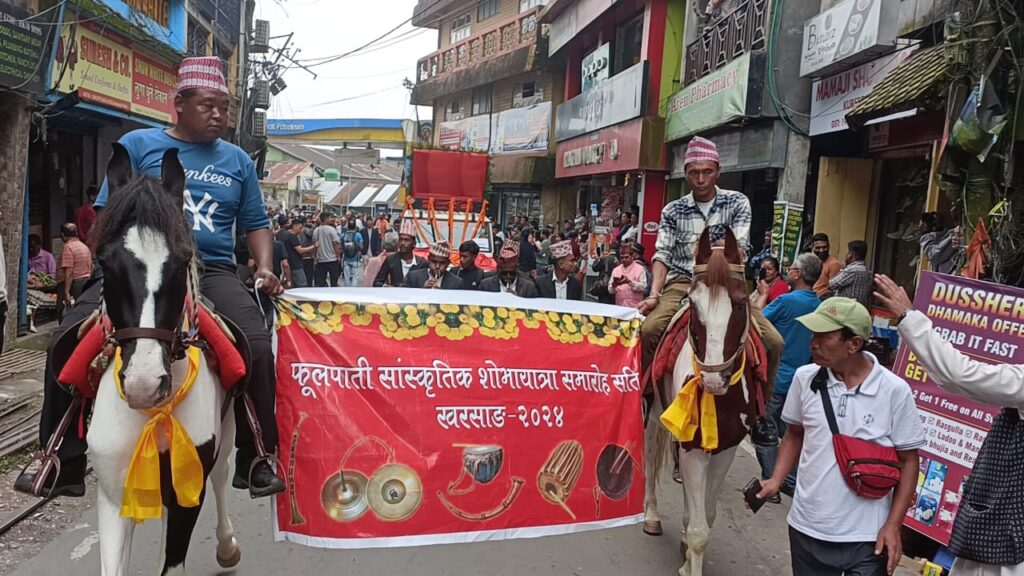 खरसाङ: खरसाङमा भव्यताको साथमा फूलपाती सांस्कृतिक शोभायात्रा निकालिएको छ। खरसाङ नगरपालिका र गोर्खाल्याण्ड क्षेत्रीय प्रशासनको सूचना अनि सांस्कृतिक विभागको संयुक्त आयोजना तथा फूलपाती समारोह समितिको आयोजनामा खरसाङमा भव्य रूपमा फूलपाती शोभायात्रा आयोजना गरिएको छ। खरसाङको मोटर स्ट्याण्डबाट विभिन्न संघ संस्थाहरूका प्रतिनिधिहरू उपस्थिति र सहभागितामा शुरू भएको सांस्कृतिक शोभायात्रा खरसाङ बजार परिक्रमा गर्दै अस्पताल मोड़बाट वर्ध्दमान रोड हुँदै पुनः मोटर स्ट्याण्ड पुगेर खरसाङको नयाँ बजारस्थित सार्वजनिक भवनमा समापन गरिएको छ।